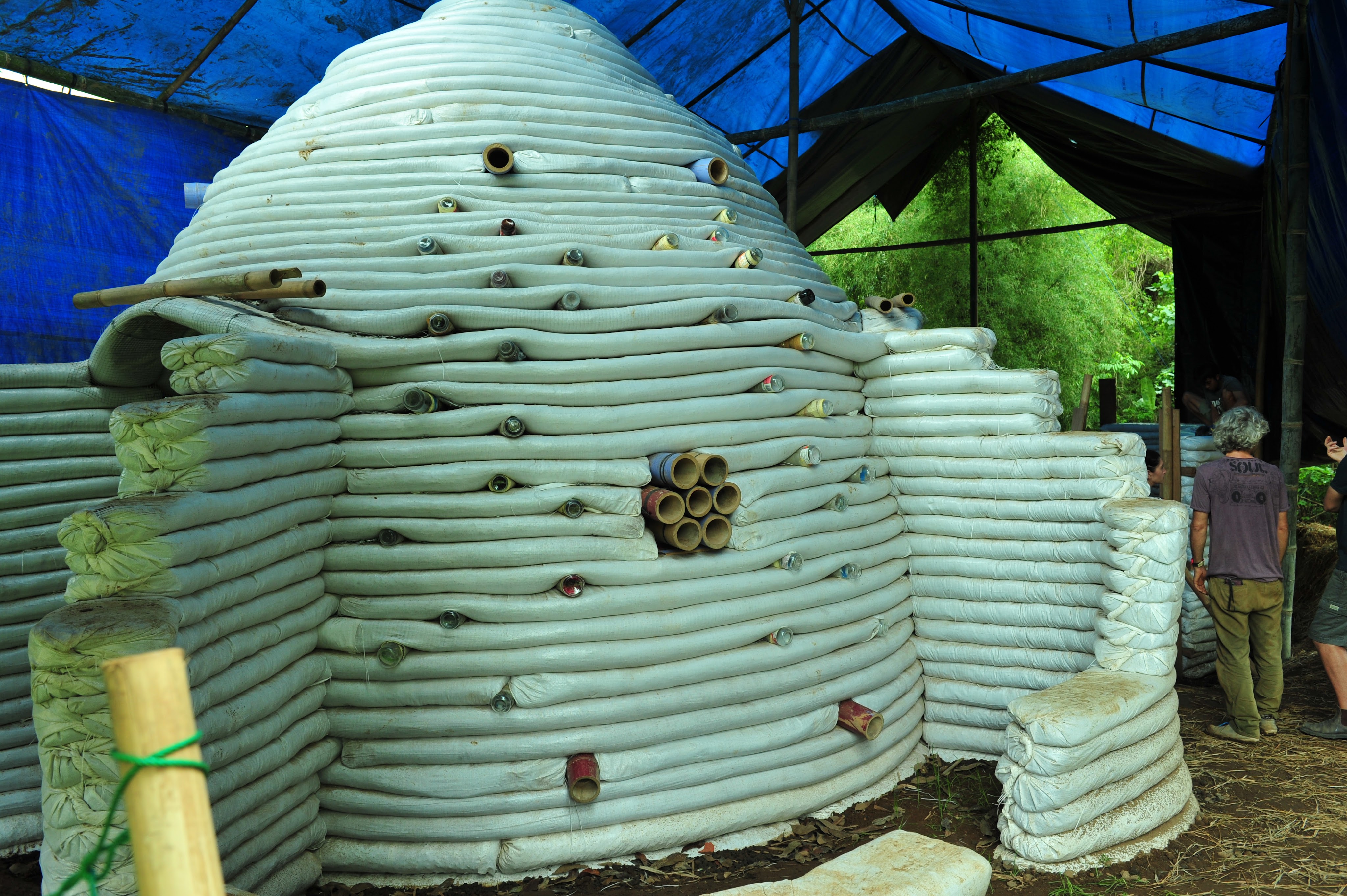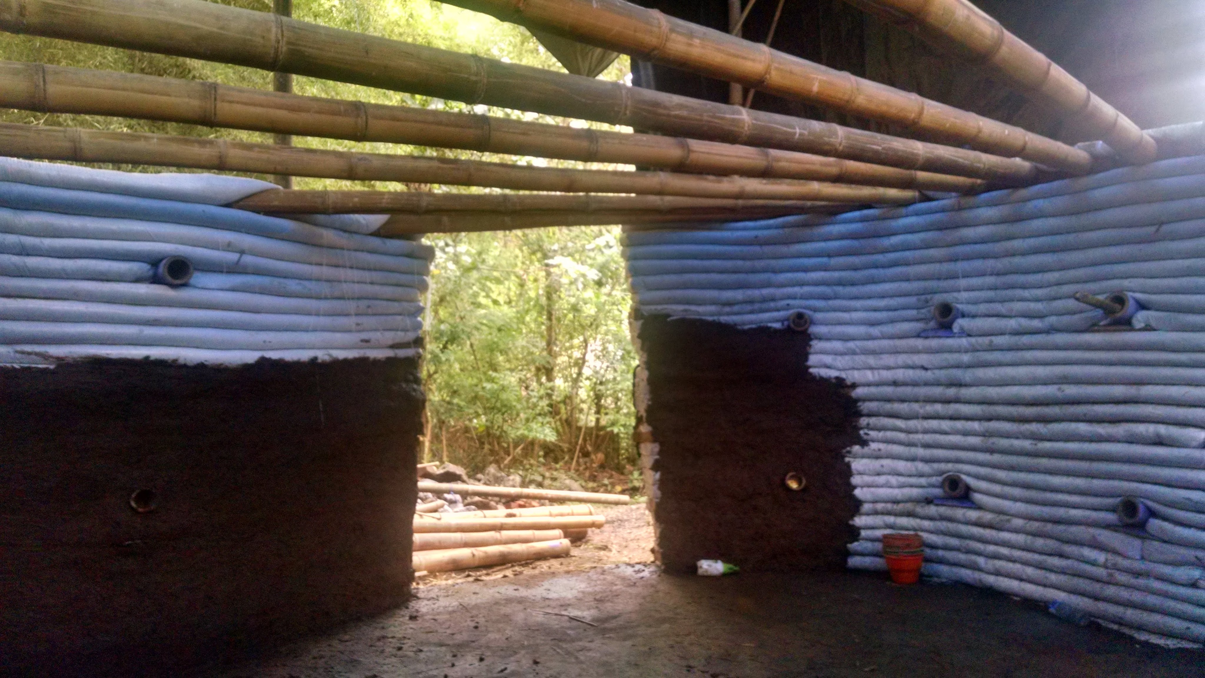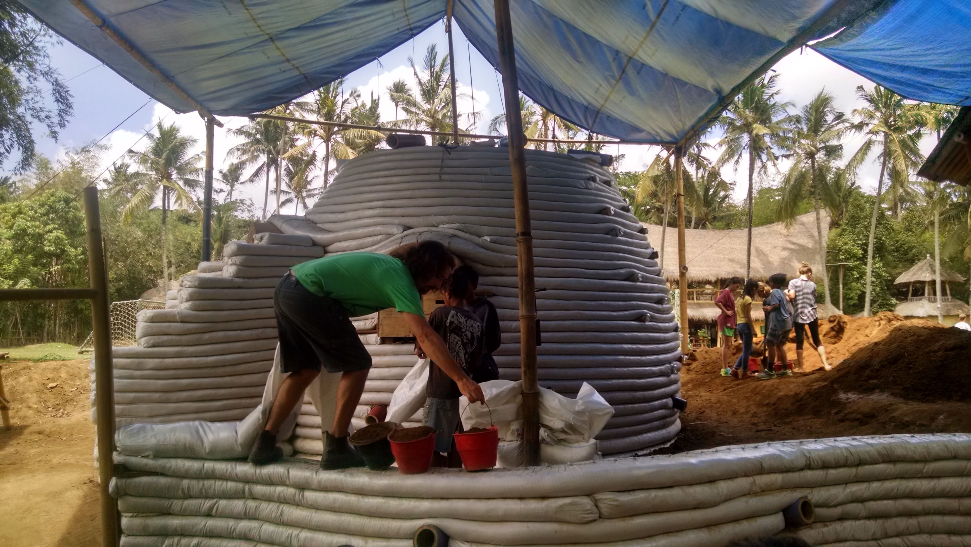 Earthbag building is a an incredible way to use local soil to make rammed earth structures that can be load bearing without form materials or additional frame work. The bags can be continuous between openings and can make curvilinear shapes that are stronger than straight square walls, especially important in earth quake zones like the ring of fire in Indonesia.