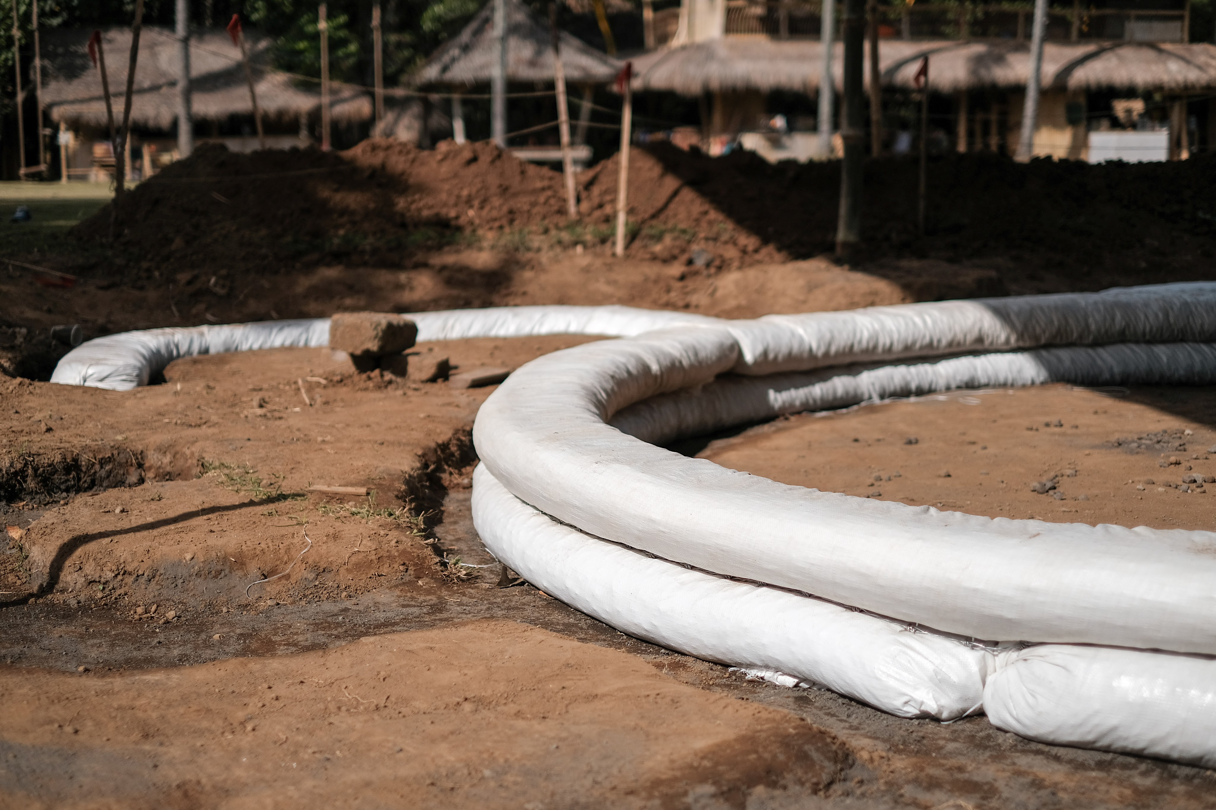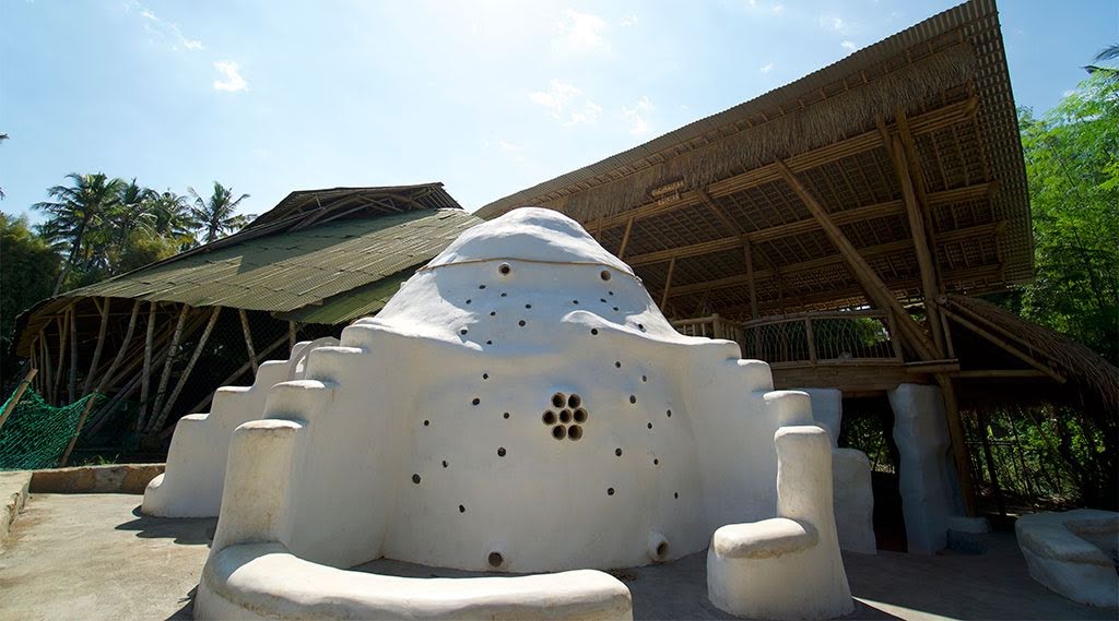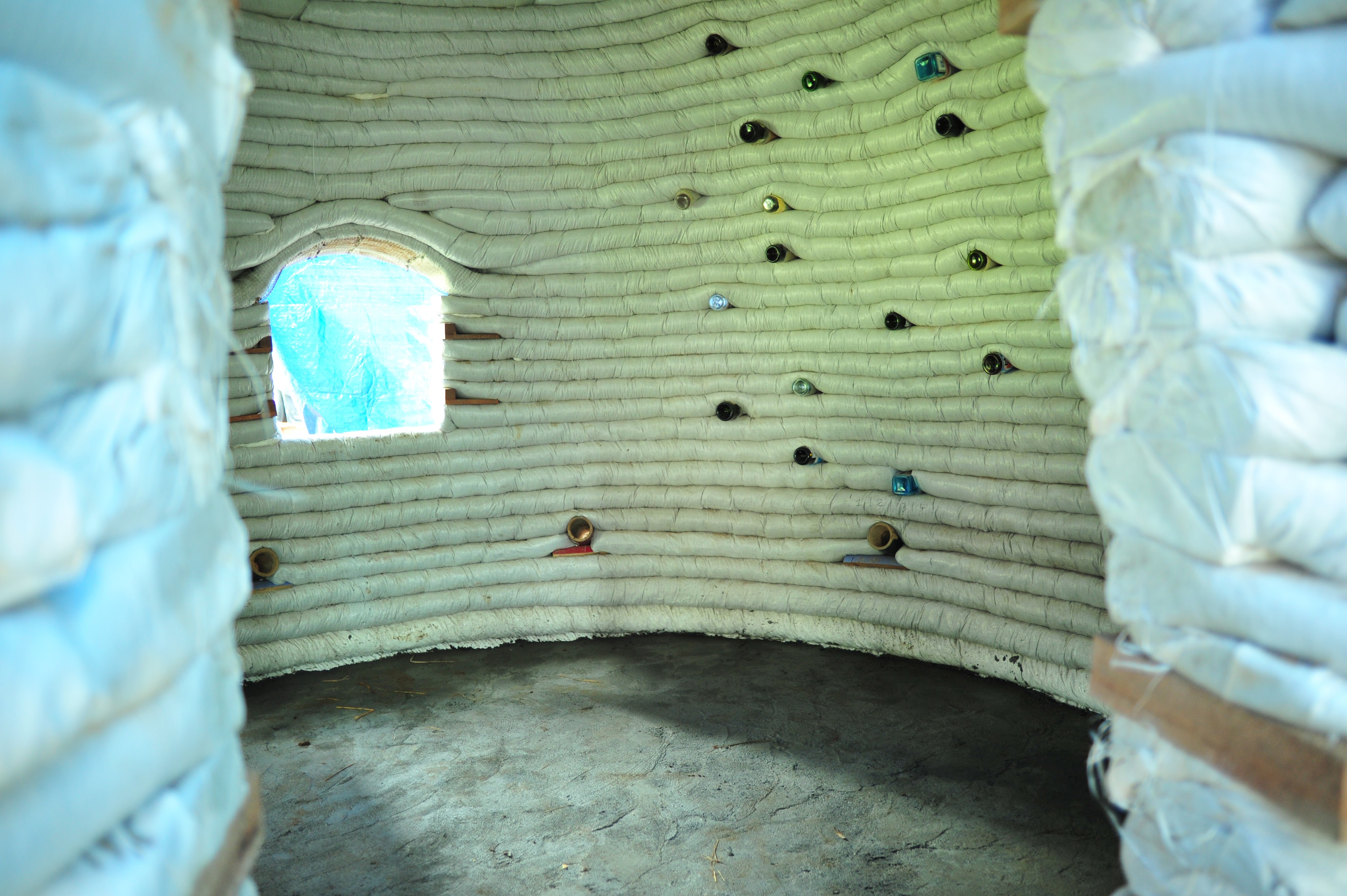 Earthbag building is a an incredible way to use local soil to make rammed earth structures that can be load bearing without form materials or additional frame work. The bags can be continuous between openings and can make curvilinear shapes that are stronger than straight square walls, especially important in earth quake zones like the ring of fire in Indonesia.