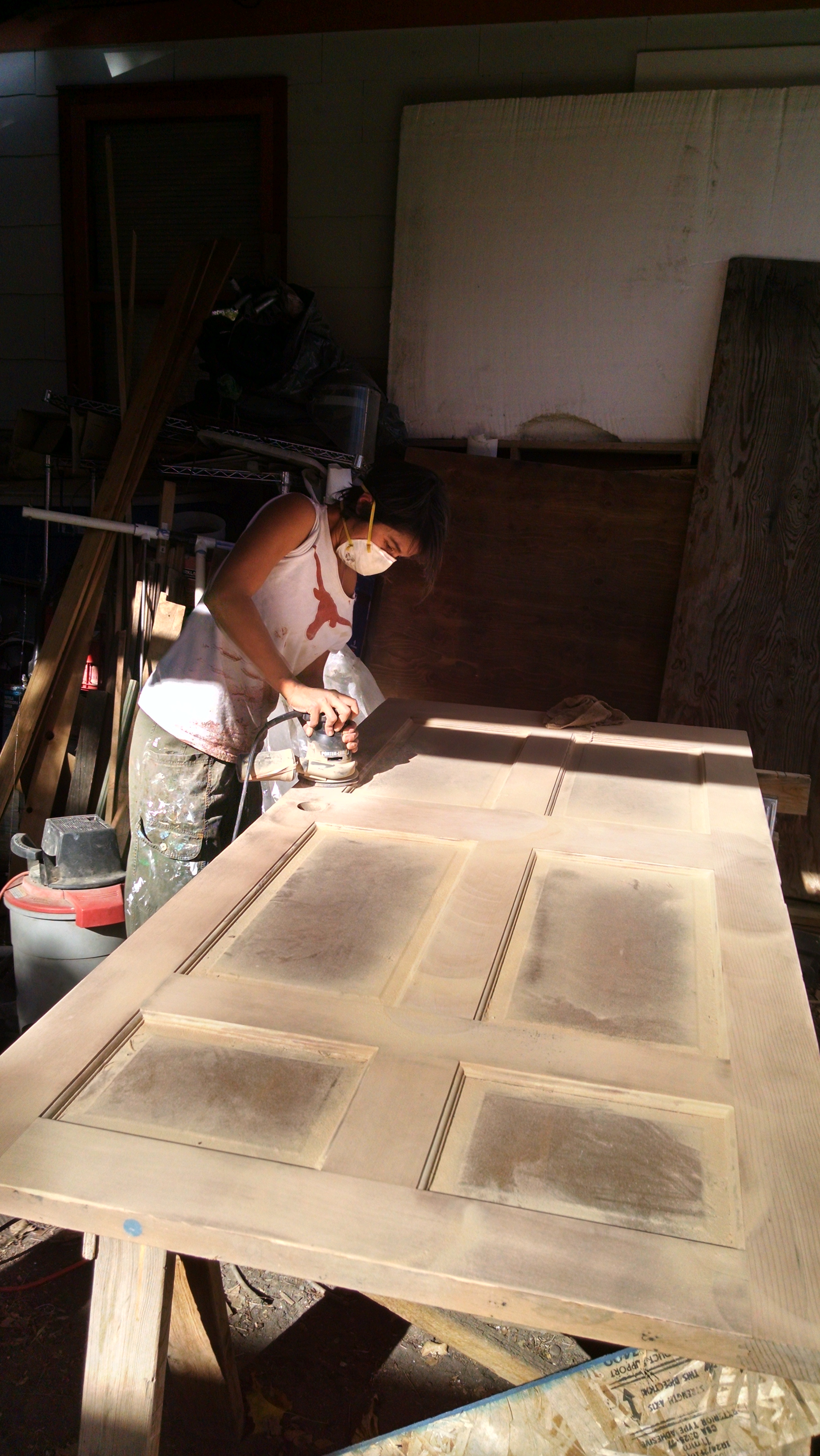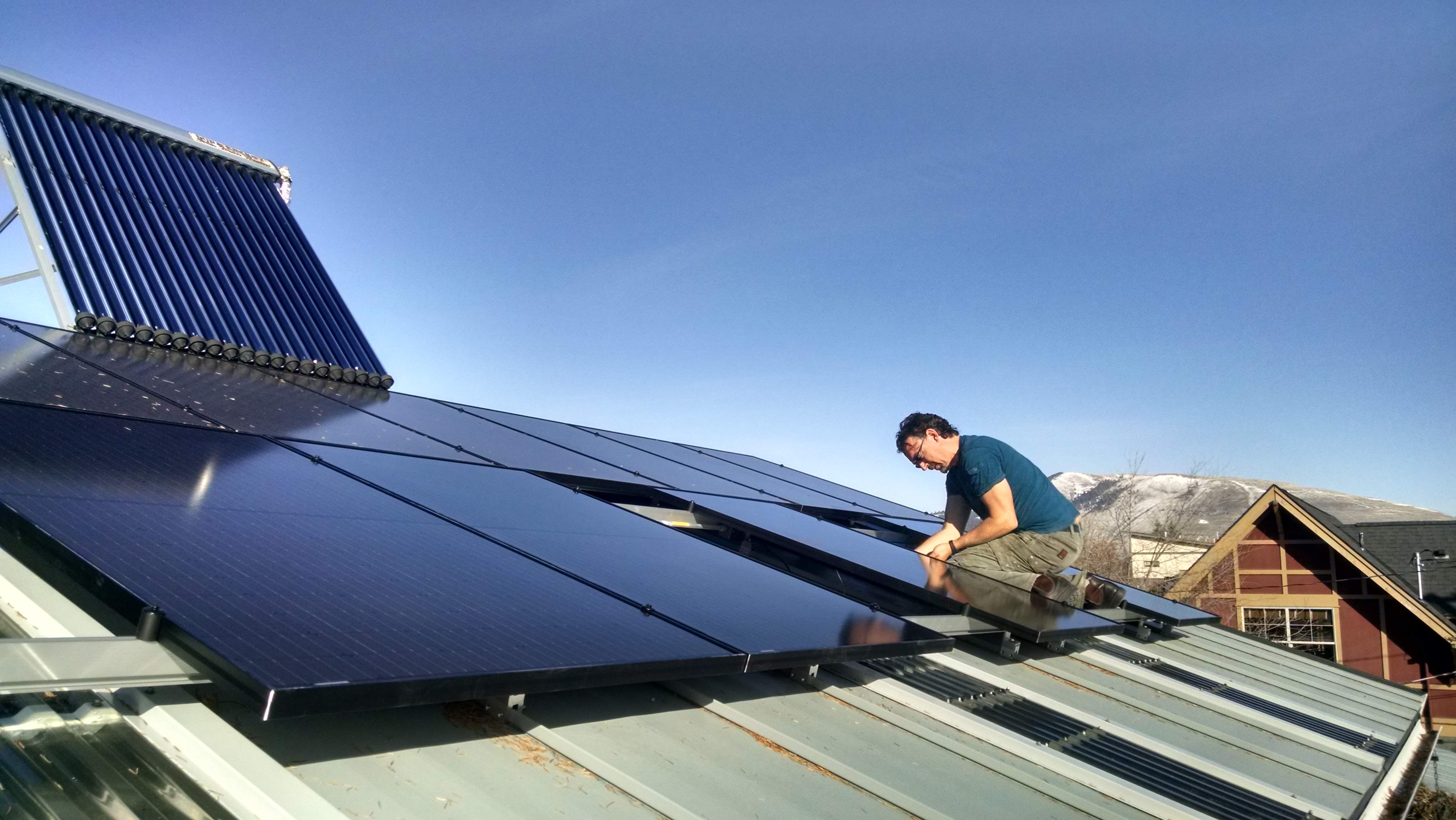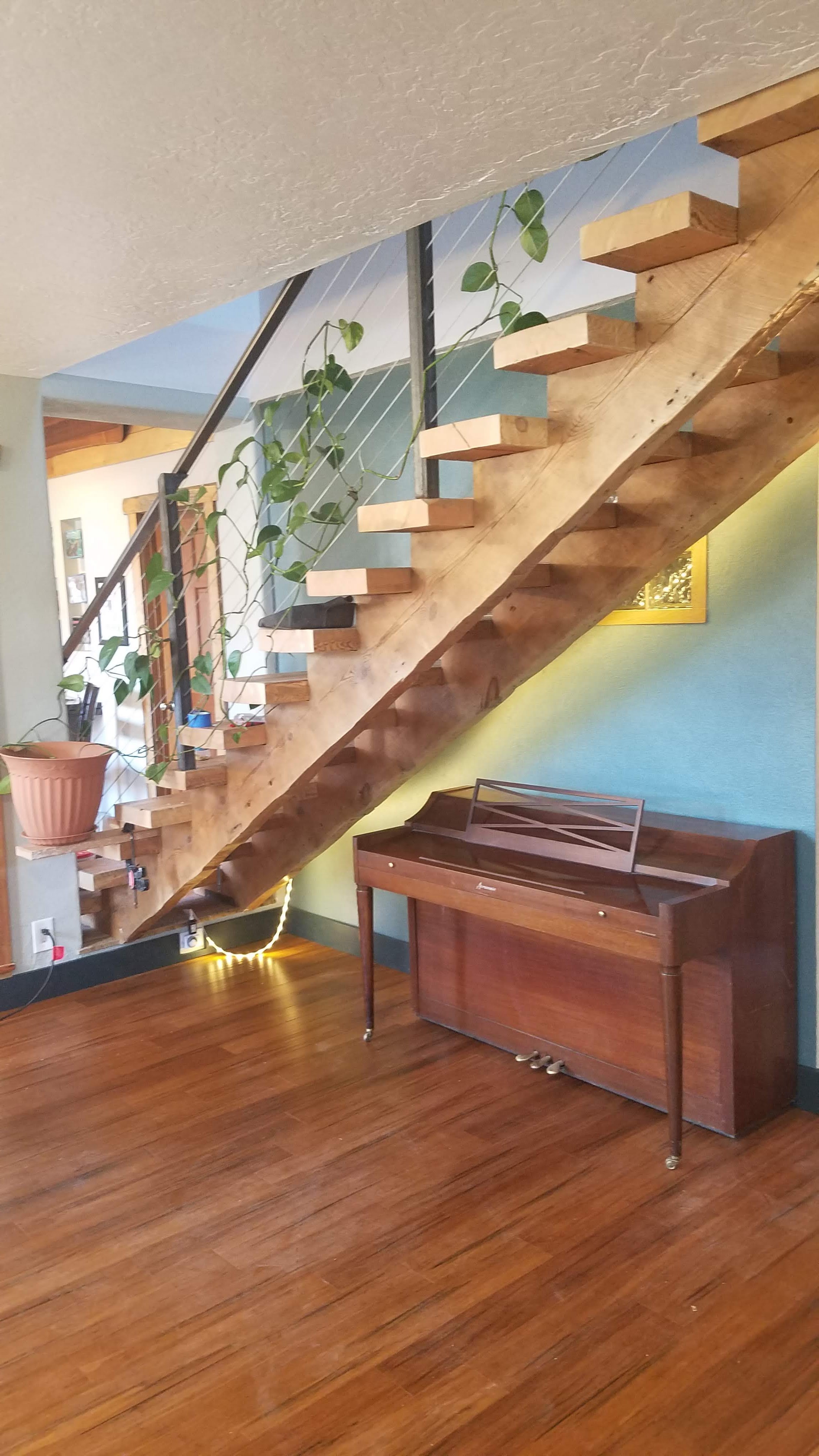 The Solar Nest is approximately 75% recycled, and reused materials including roof trusses, windows, lumber, light fixtures, cabinets, wood work and trim, roof deck and rubber, railings, insulation, plumbing, electrical, metal flashing, siding, and roofing and much more. Nearly every part of the new construction has a history and a past life. The space features unique historic salvaged flooring, and local timbers and wood work from forest restoration work. The double stud walls are dense packed with recycled cellulose insulation achieving a continuous R-38 envelope.