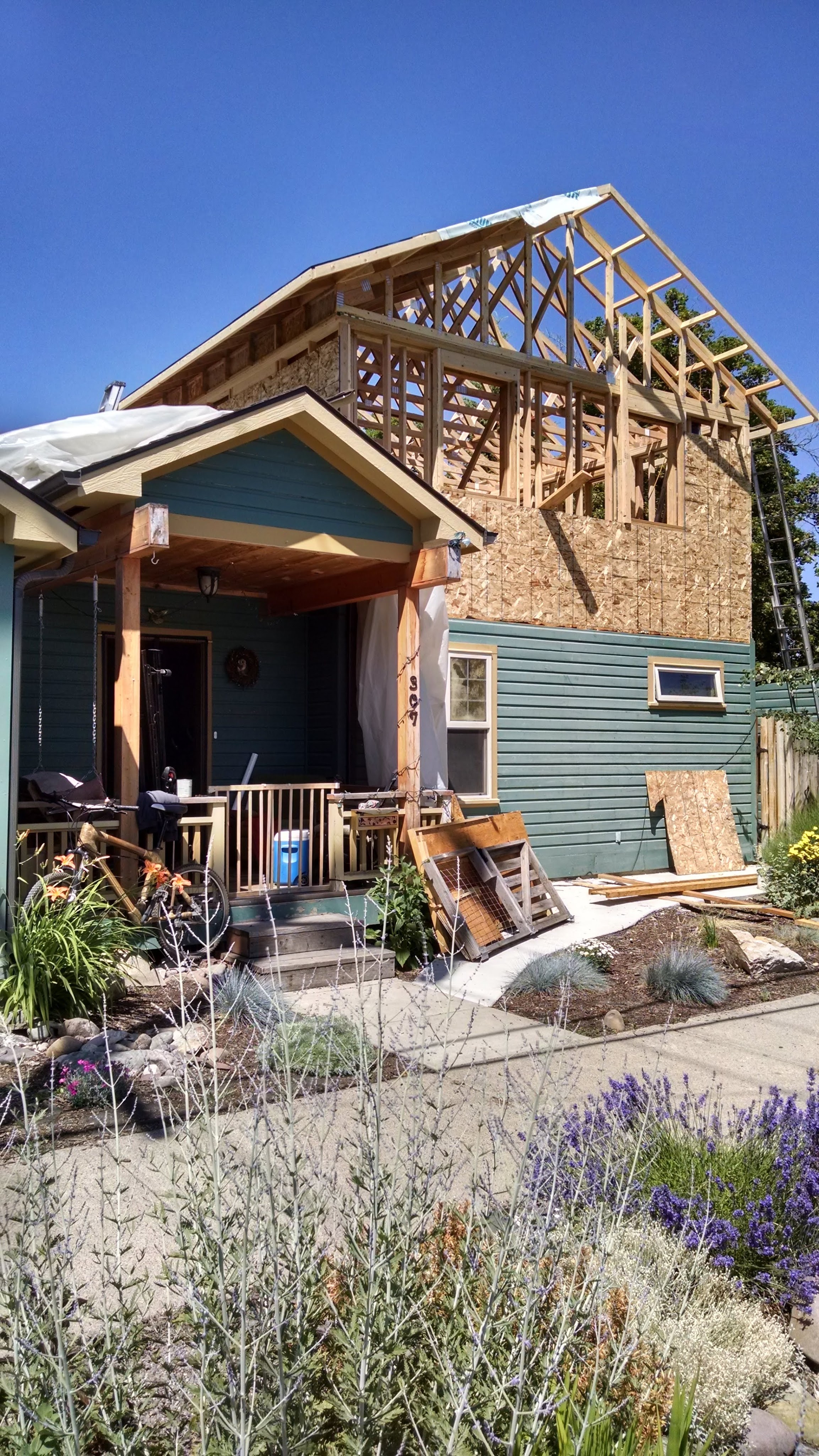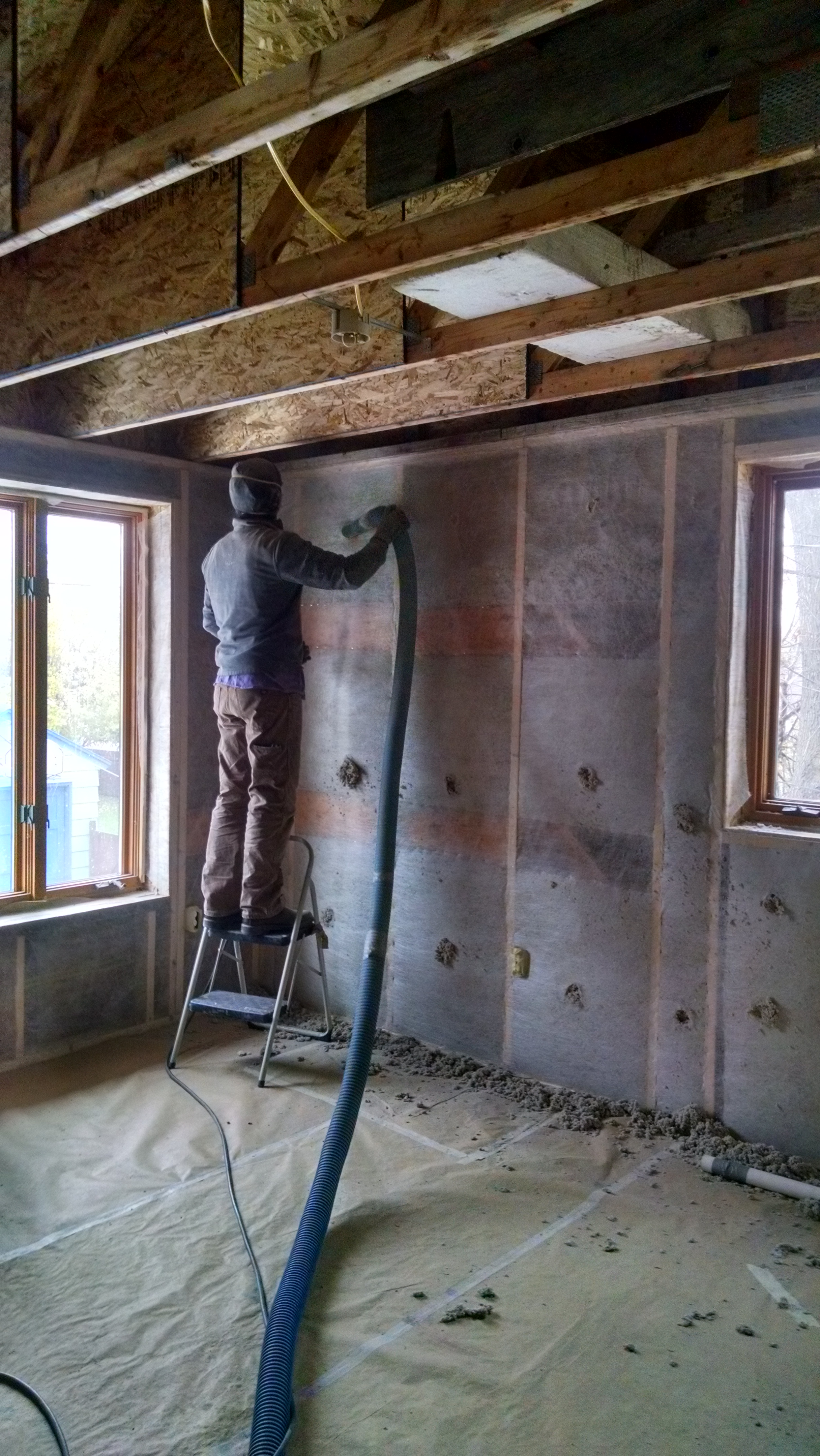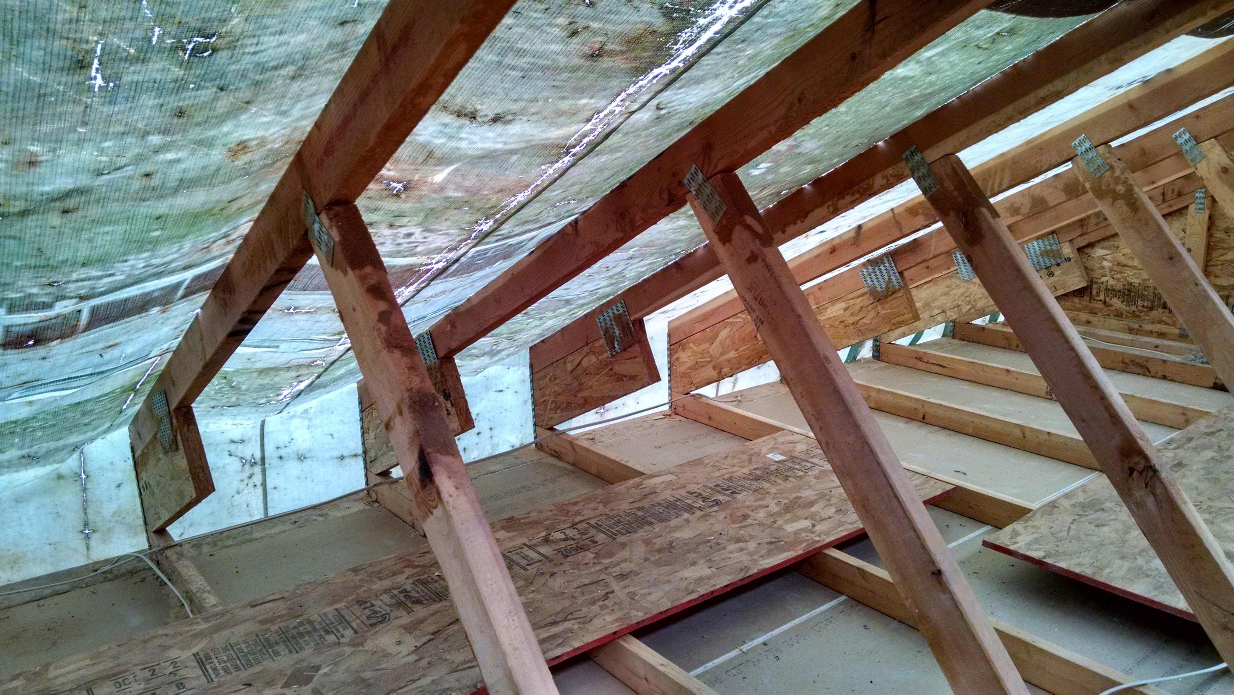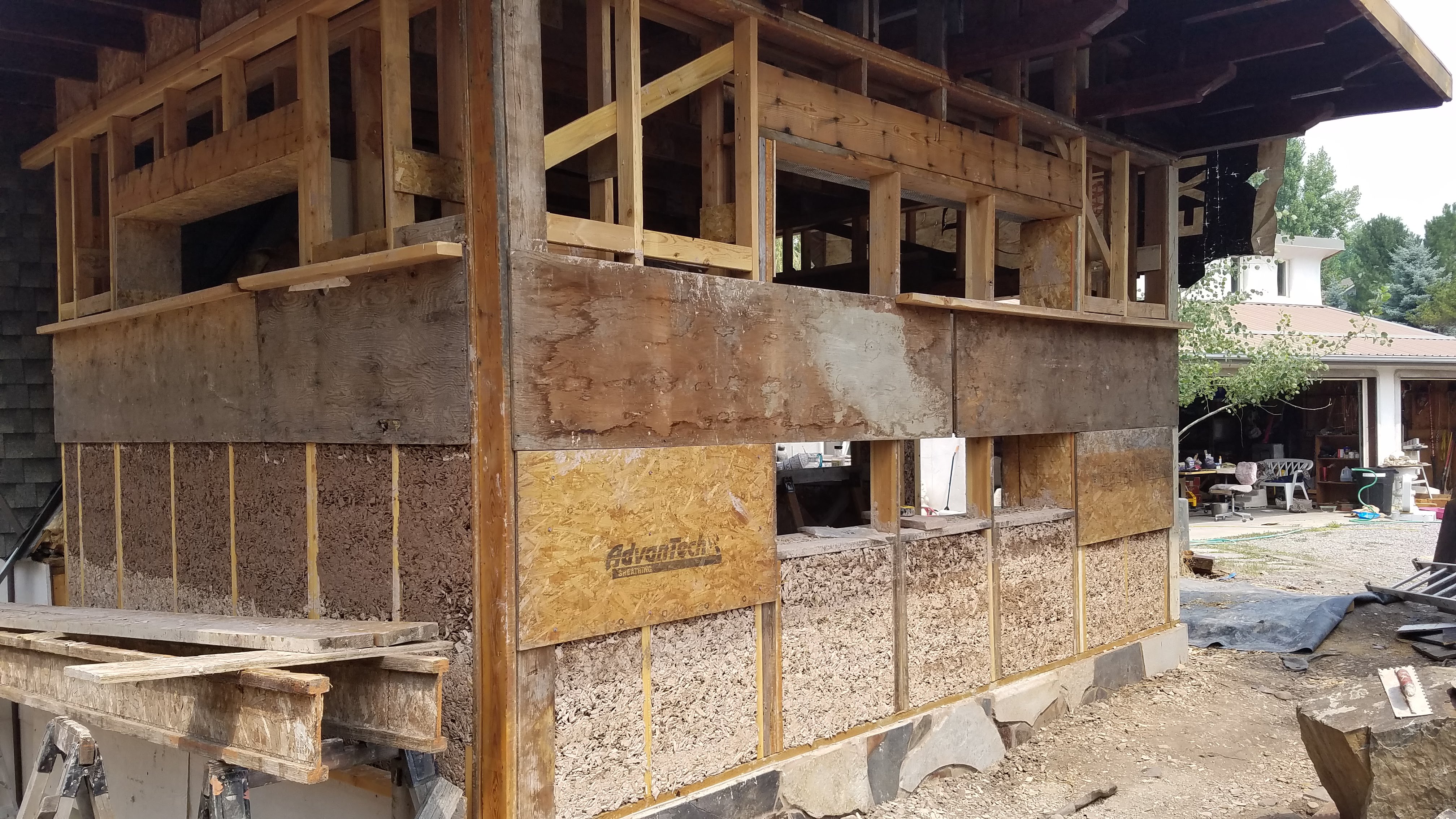 We built a floor over the existing living space and then connected the ceiling and then removed the roof of the old structure and then reused all the wood from the roof in the new double stud walls 10″ thick, with reused insulation and recycled cellulose.