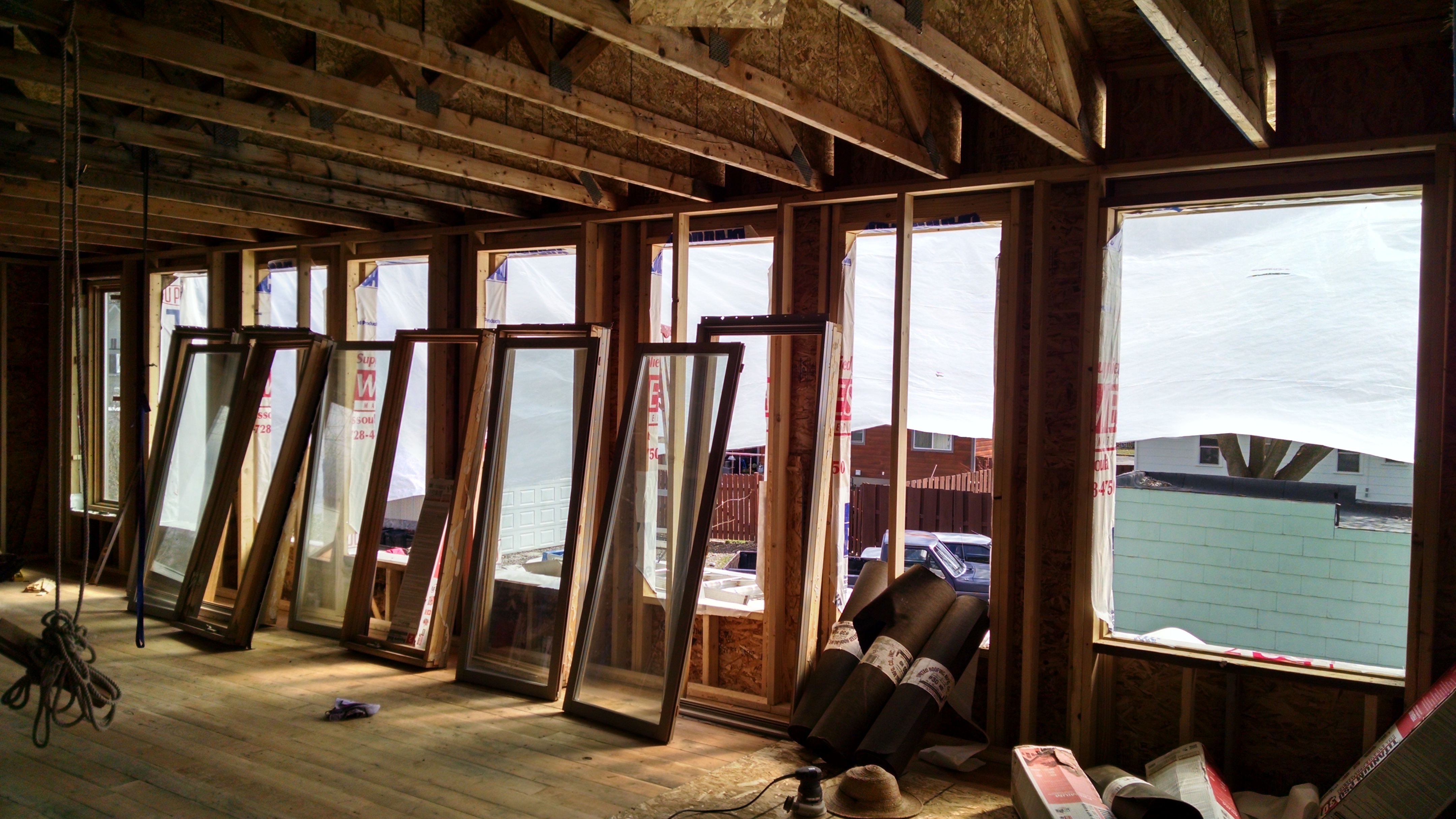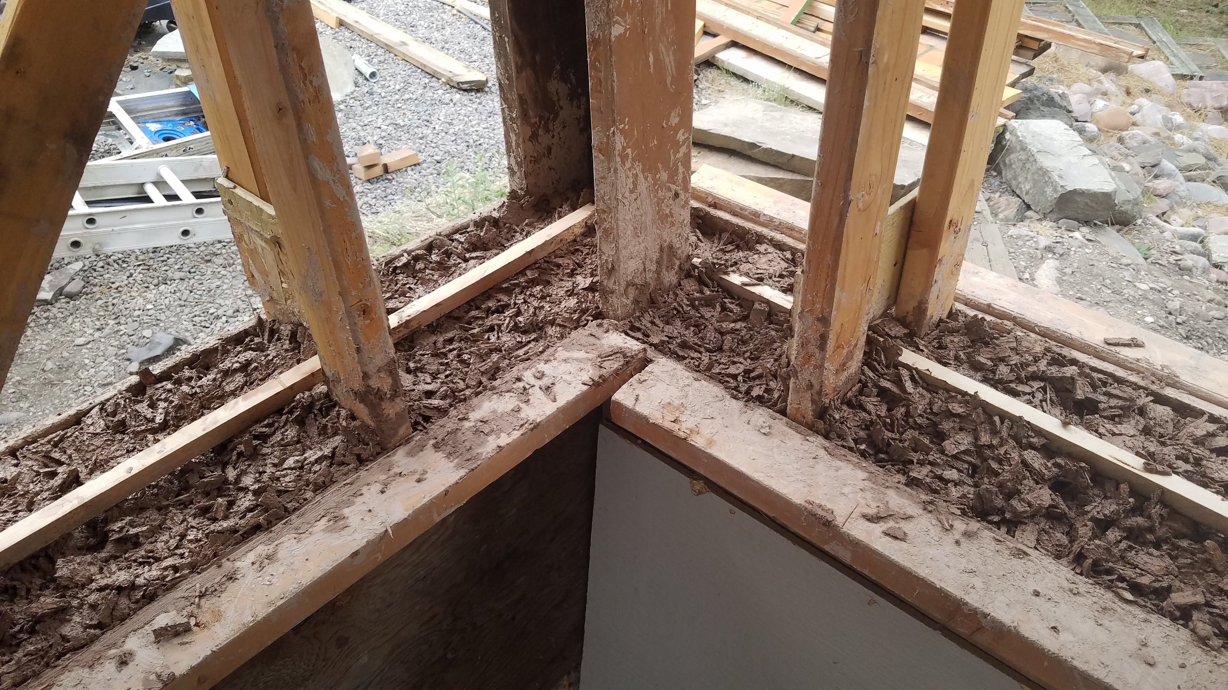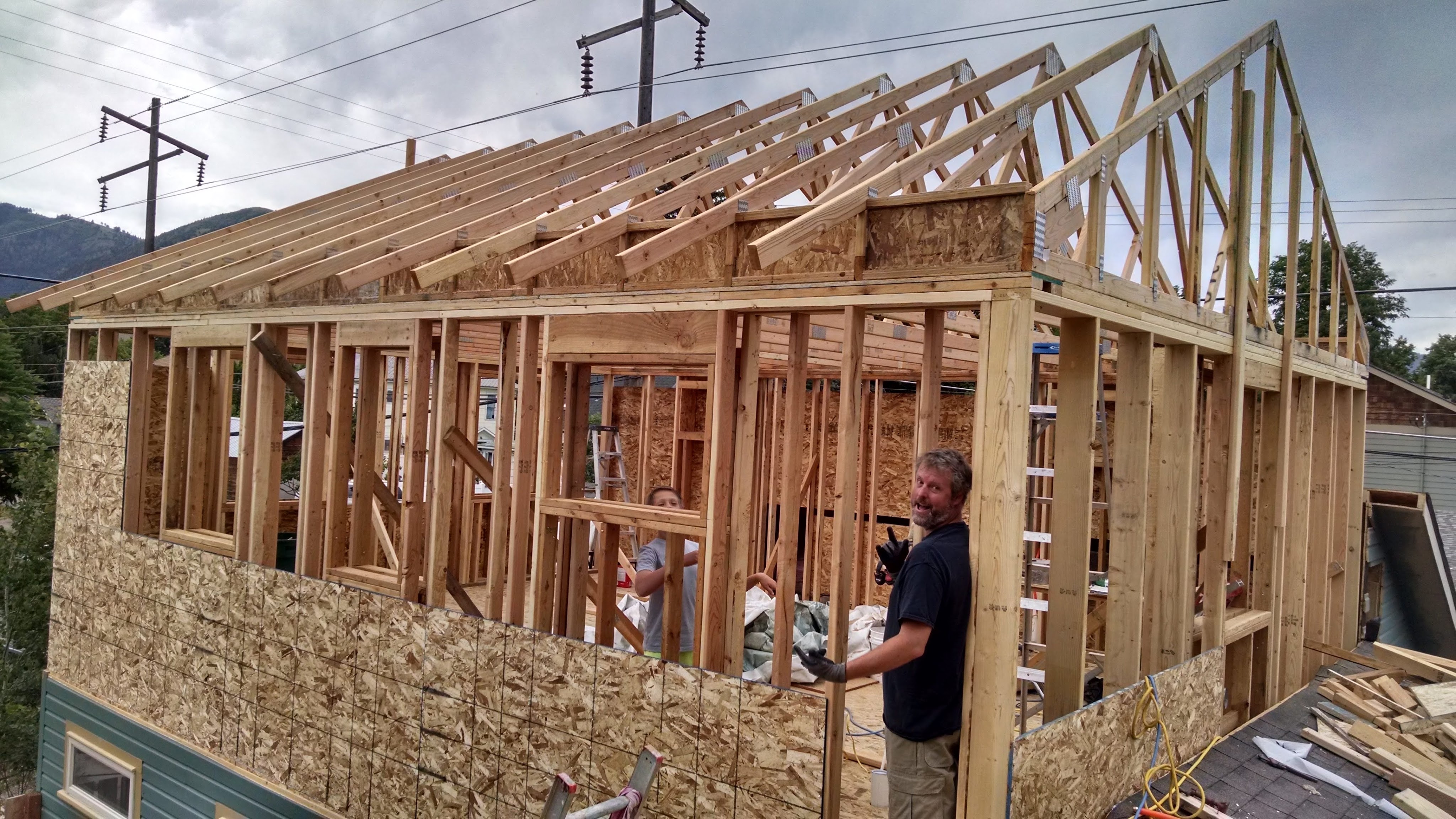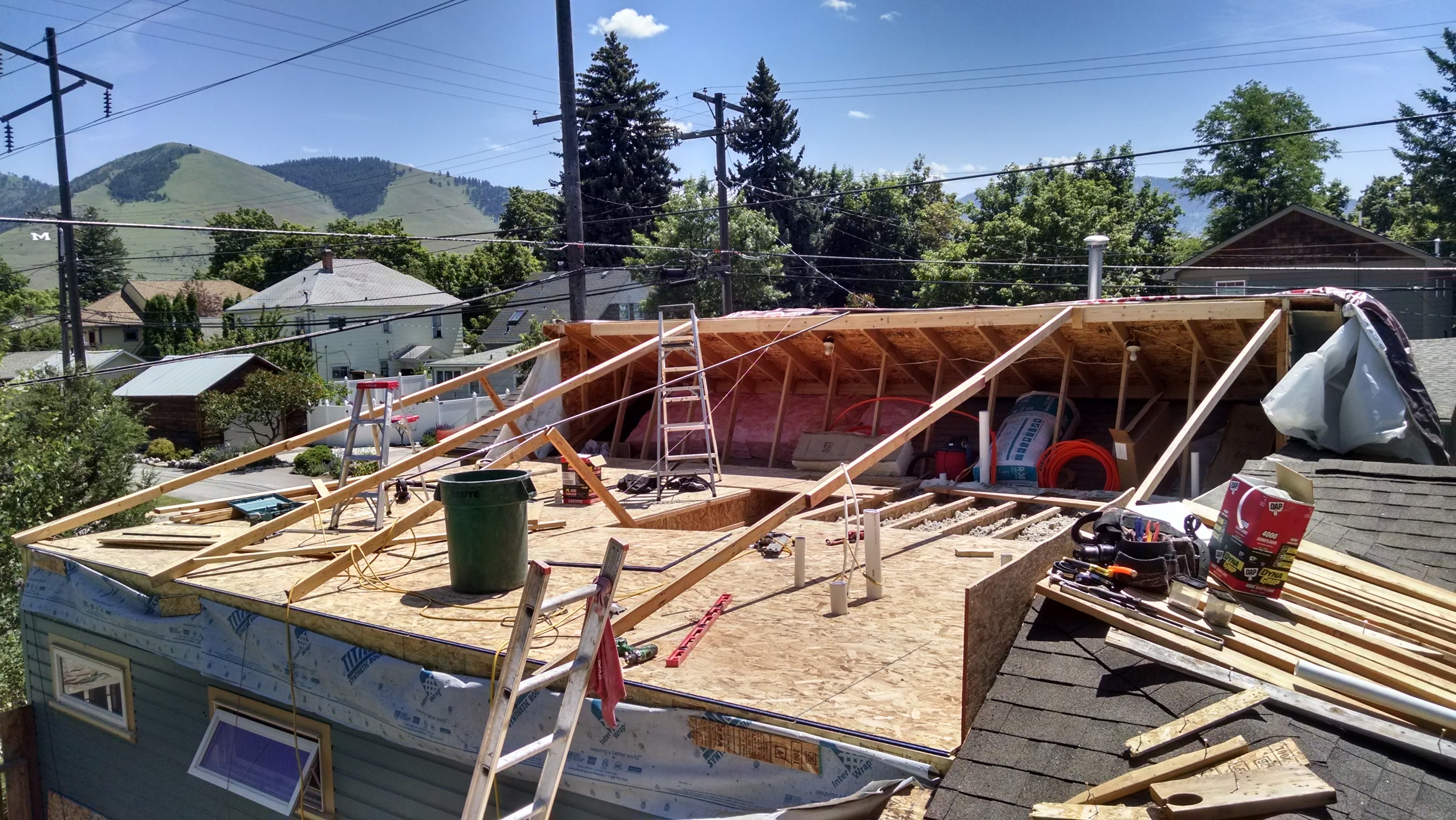 We built a floor over the existing living space and then connected the ceiling and then removed the roof of the old structure and then reused all the wood from the roof in the new double stud walls 10″ thick, with reused insulation and recycled cellulose.