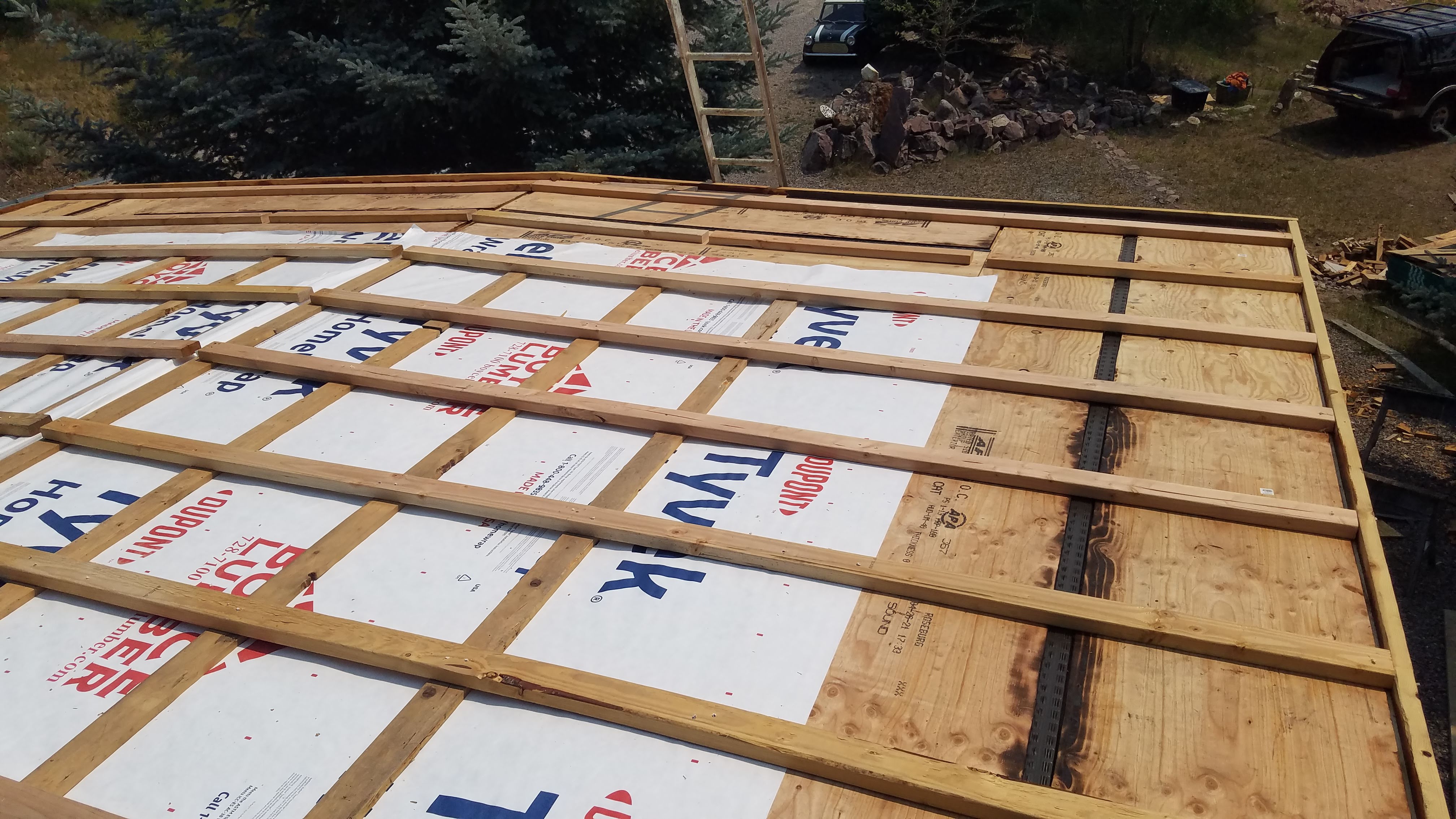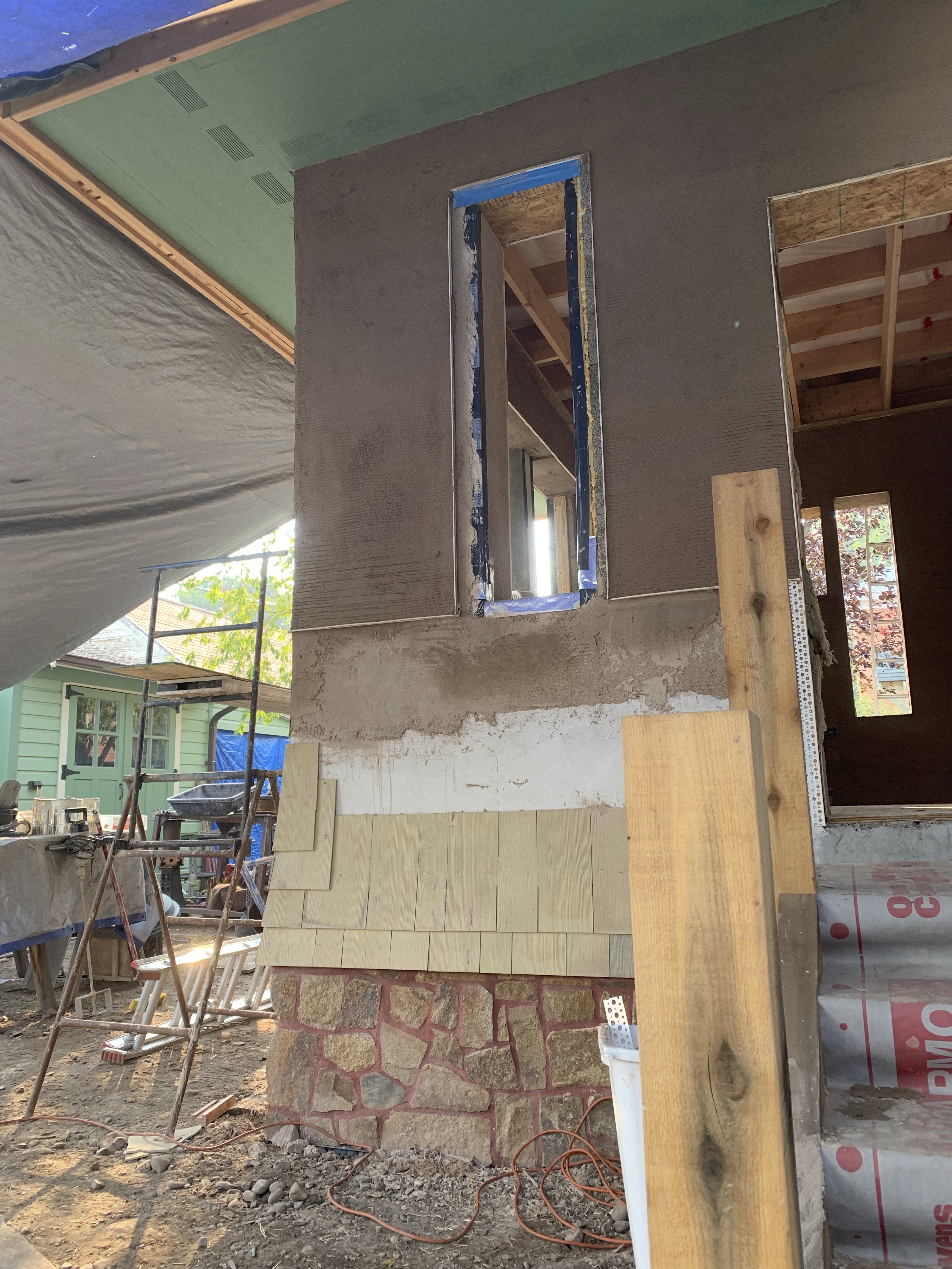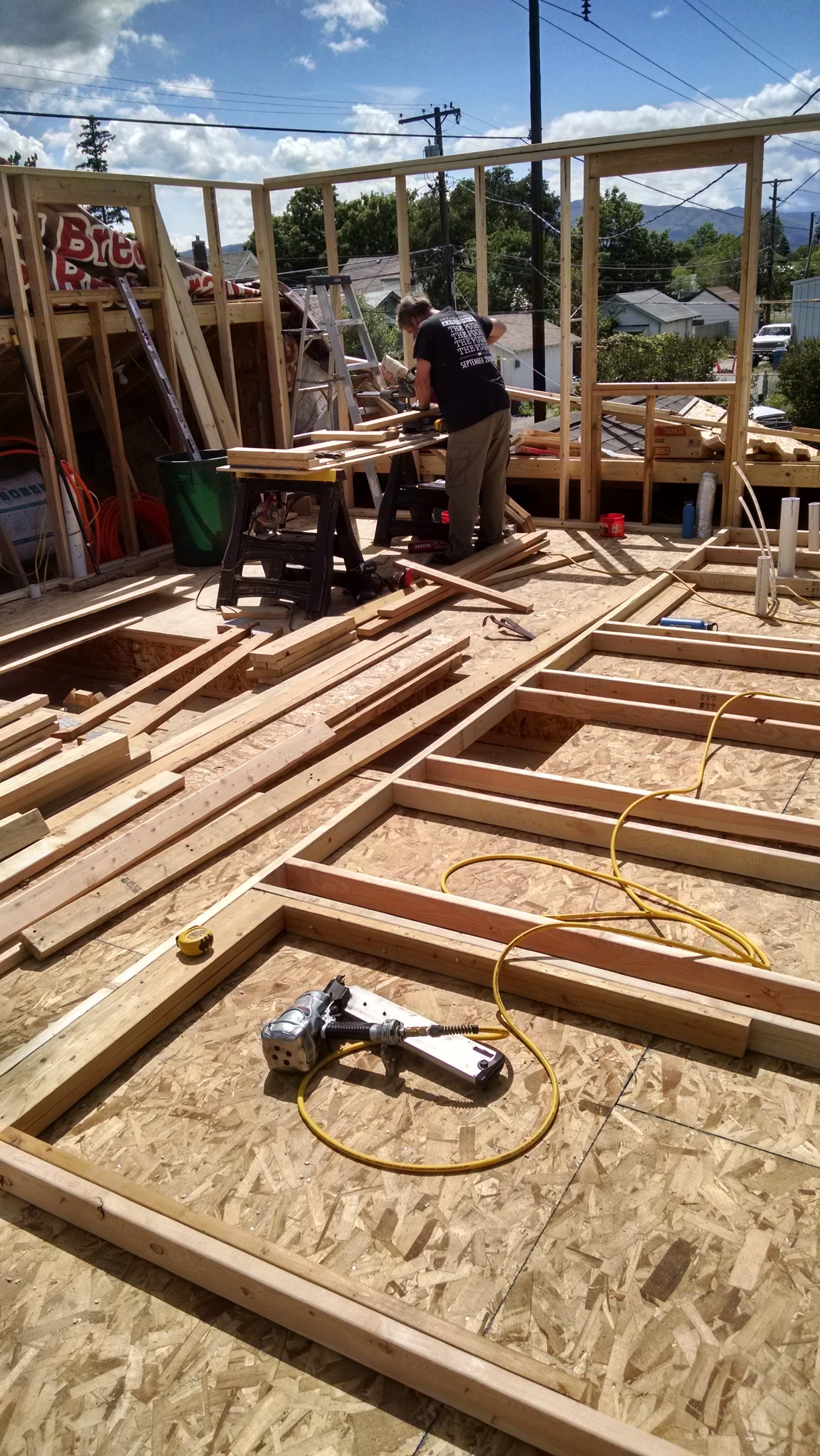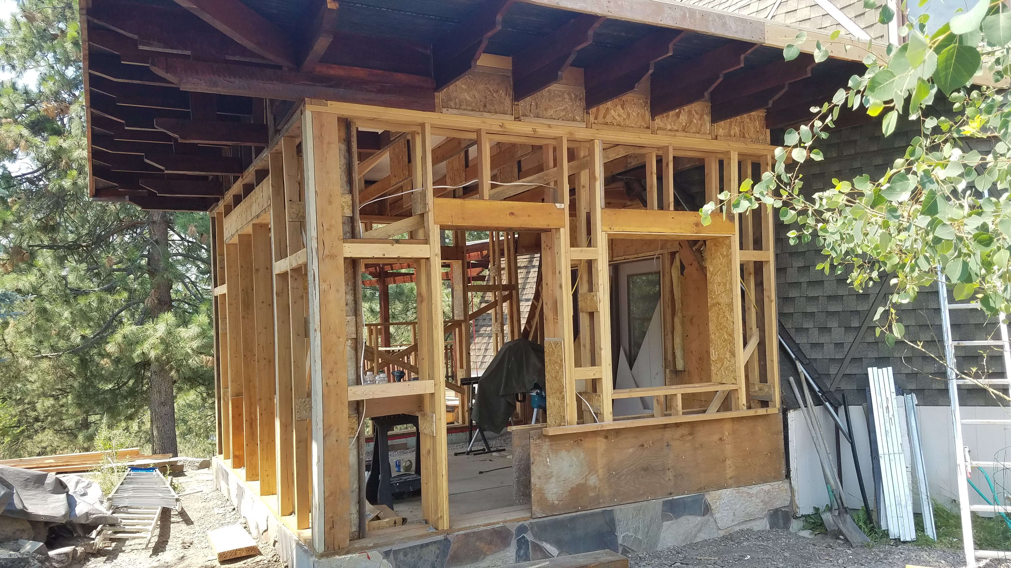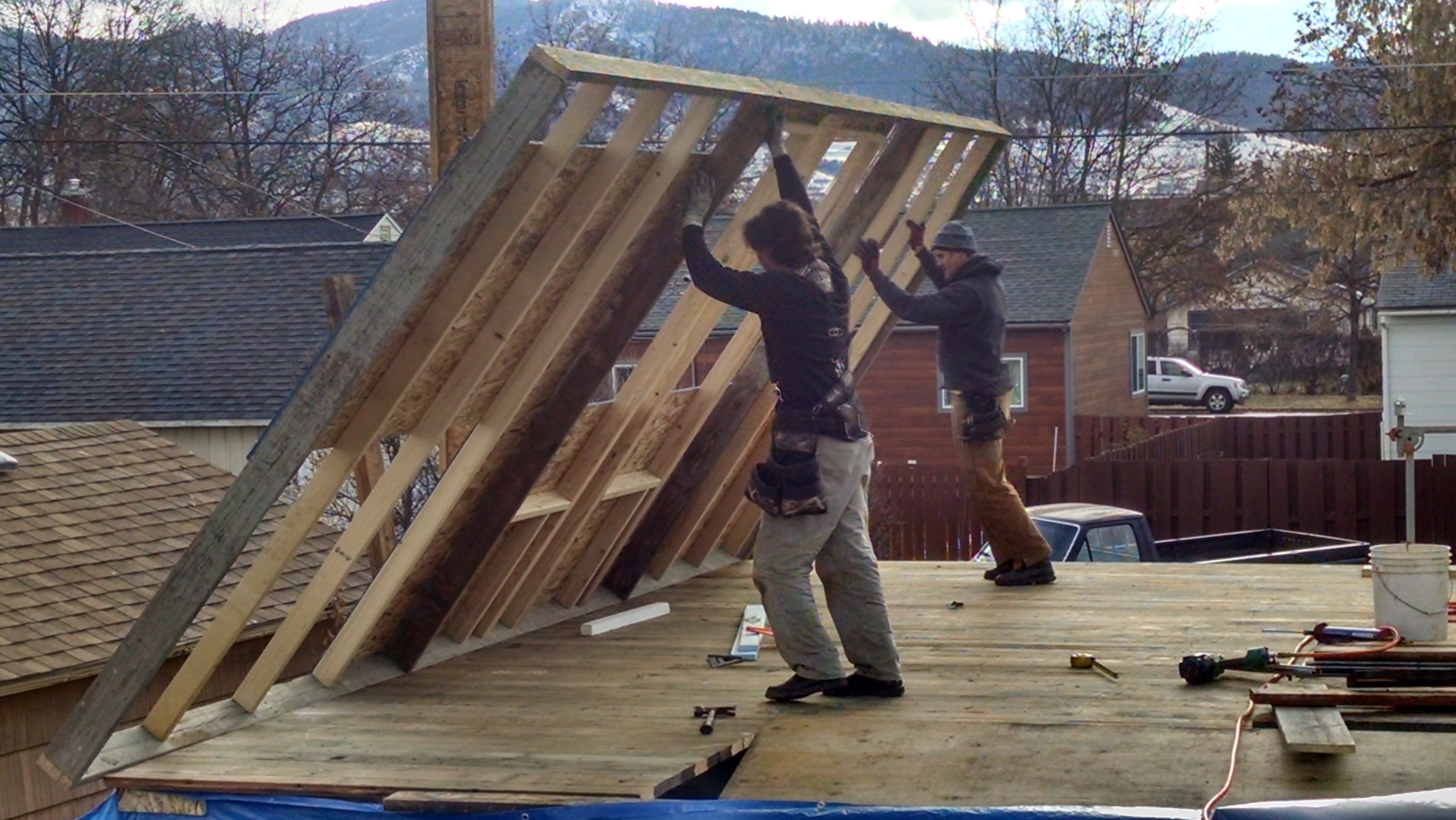 We built a floor over the existing living space and then connected the ceiling and then removed the roof of the old structure and then reused all the wood from the roof in the new double stud walls 10″ thick, with reused insulation and recycled cellulose.