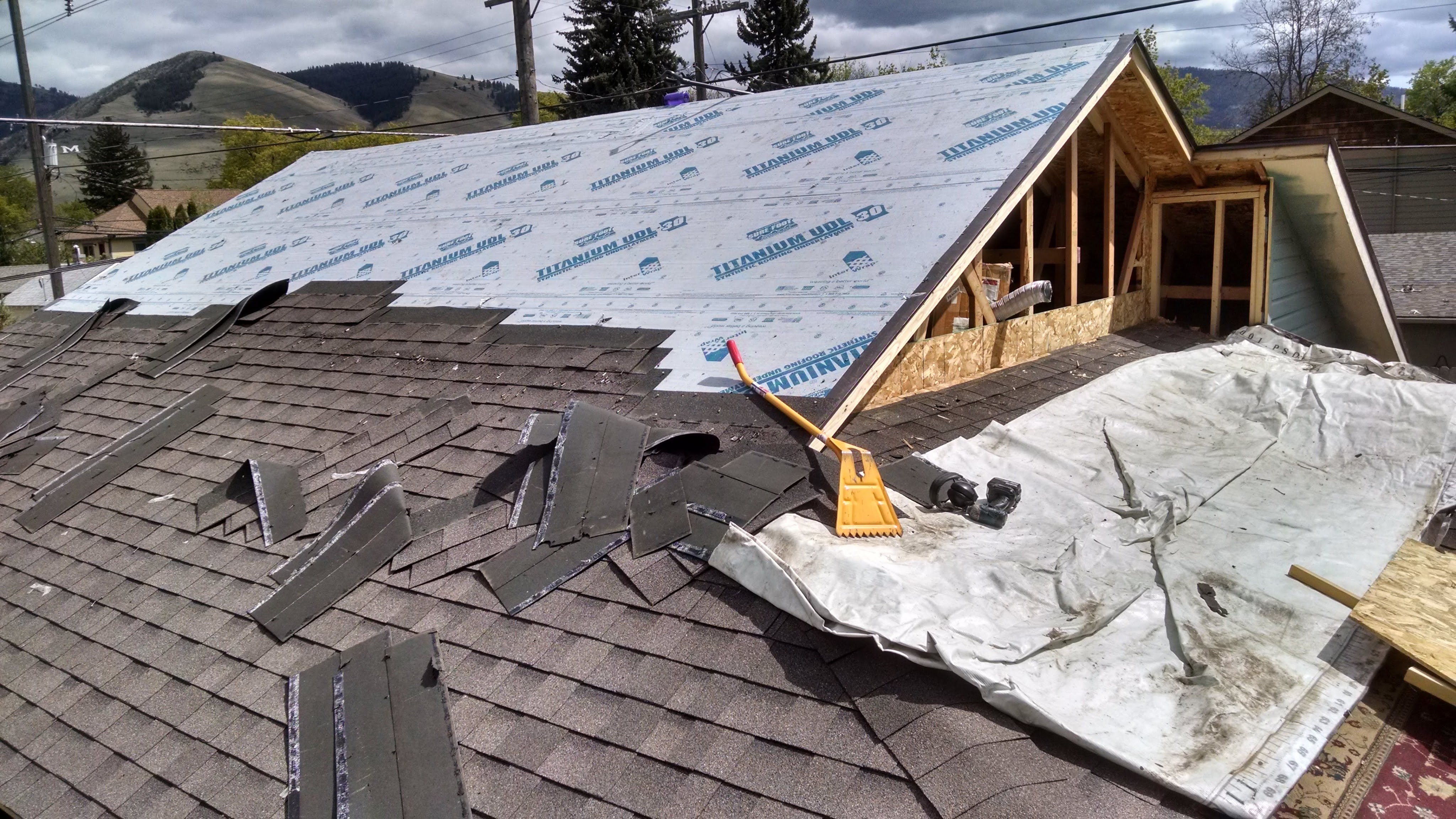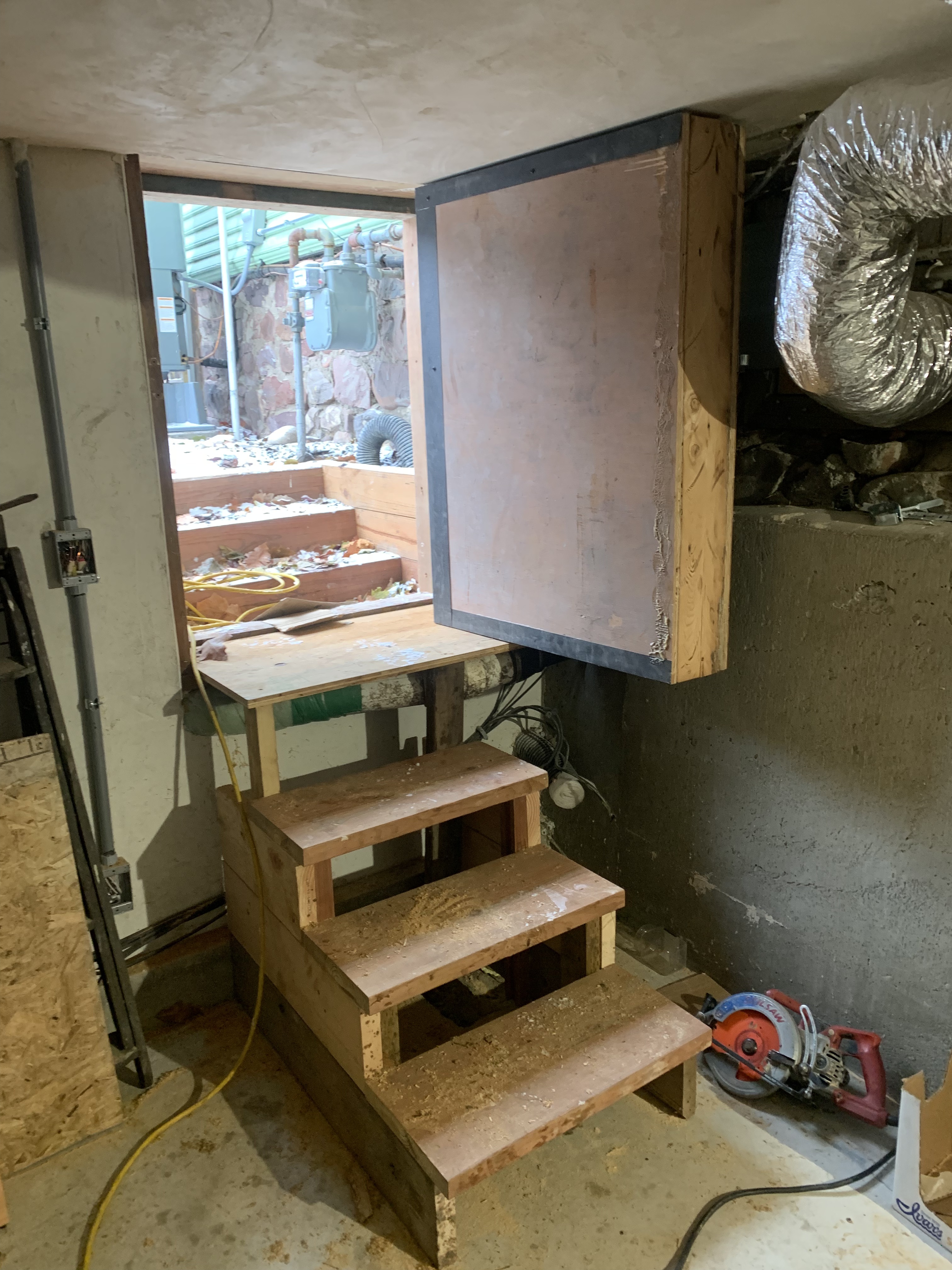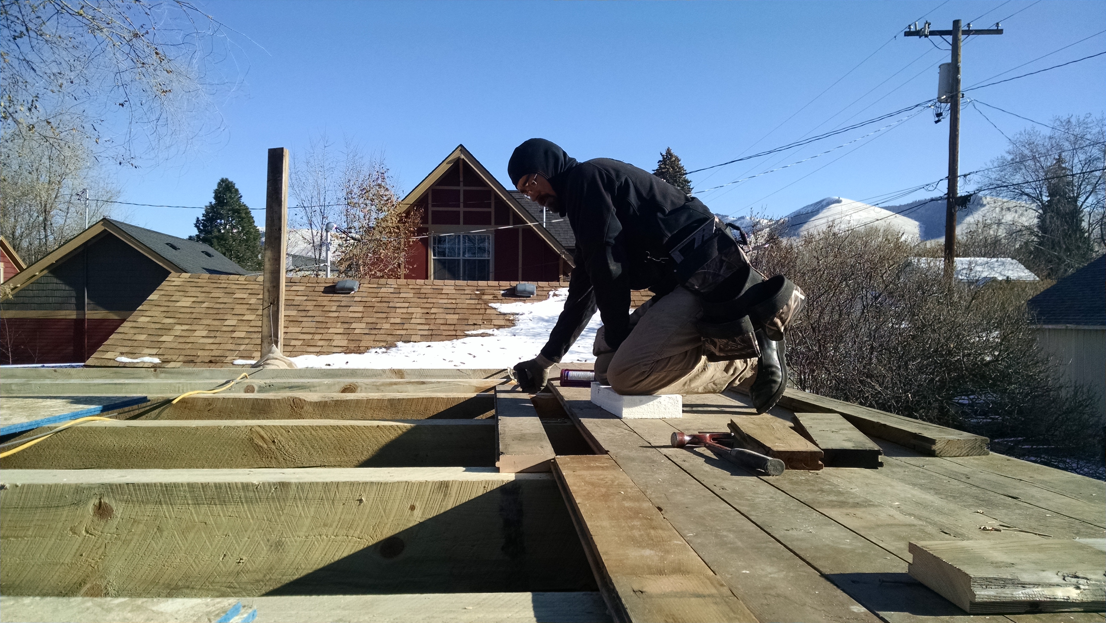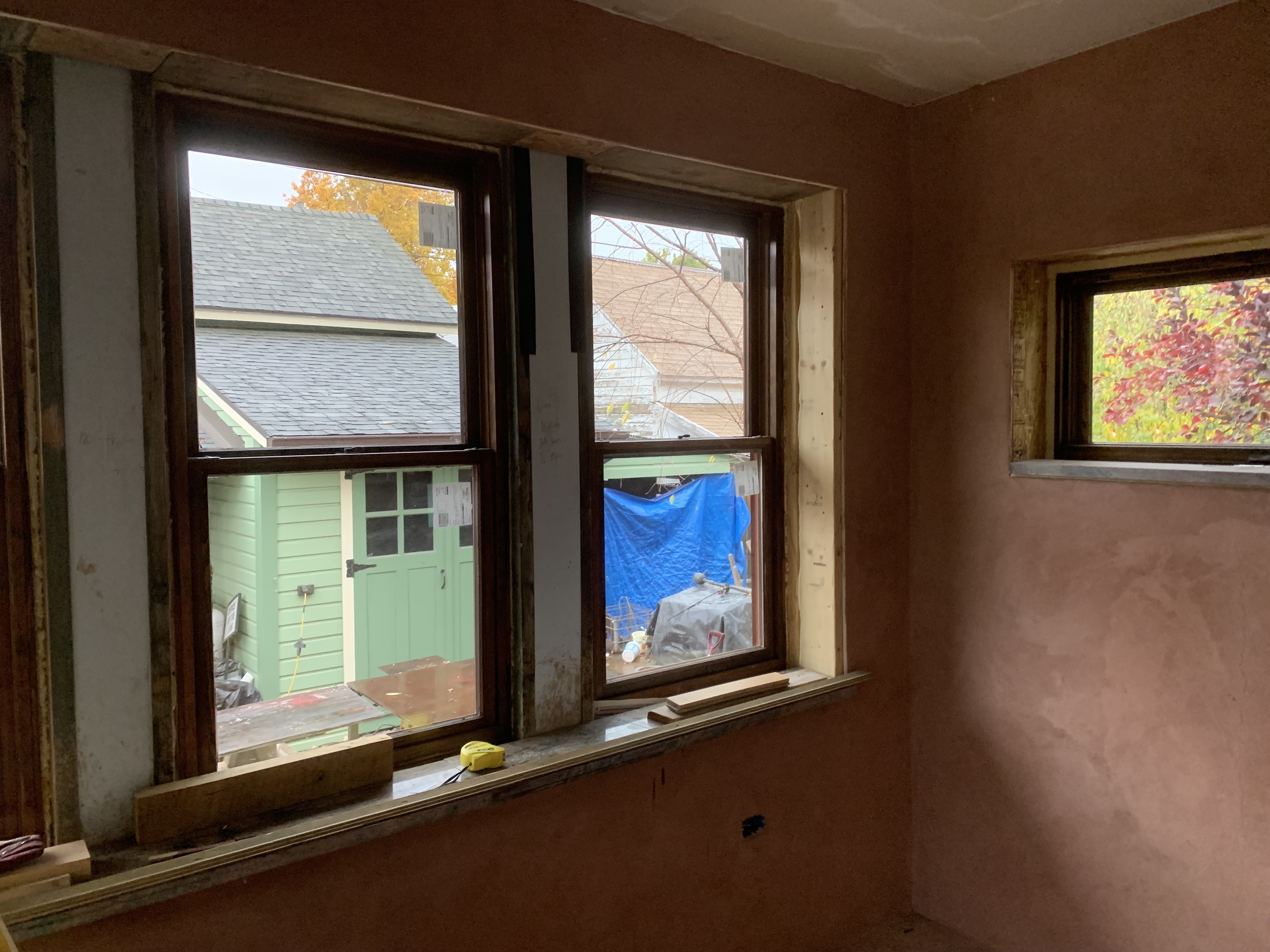 We built a floor over the existing living space and then connected the ceiling and then removed the roof of the old structure and then reused all the wood from the roof in the new double stud walls 10″ thick, with reused insulation and recycled cellulose.