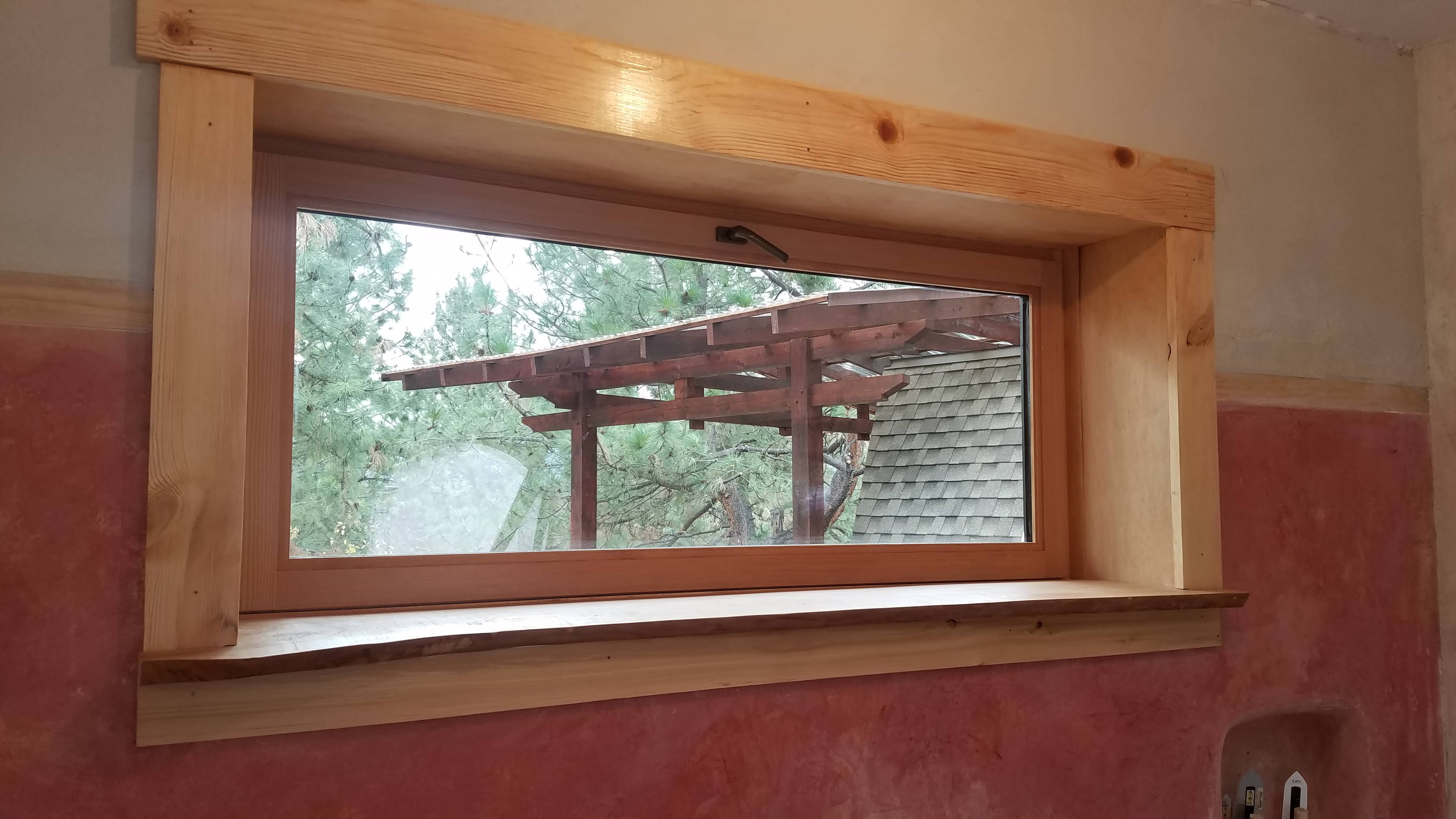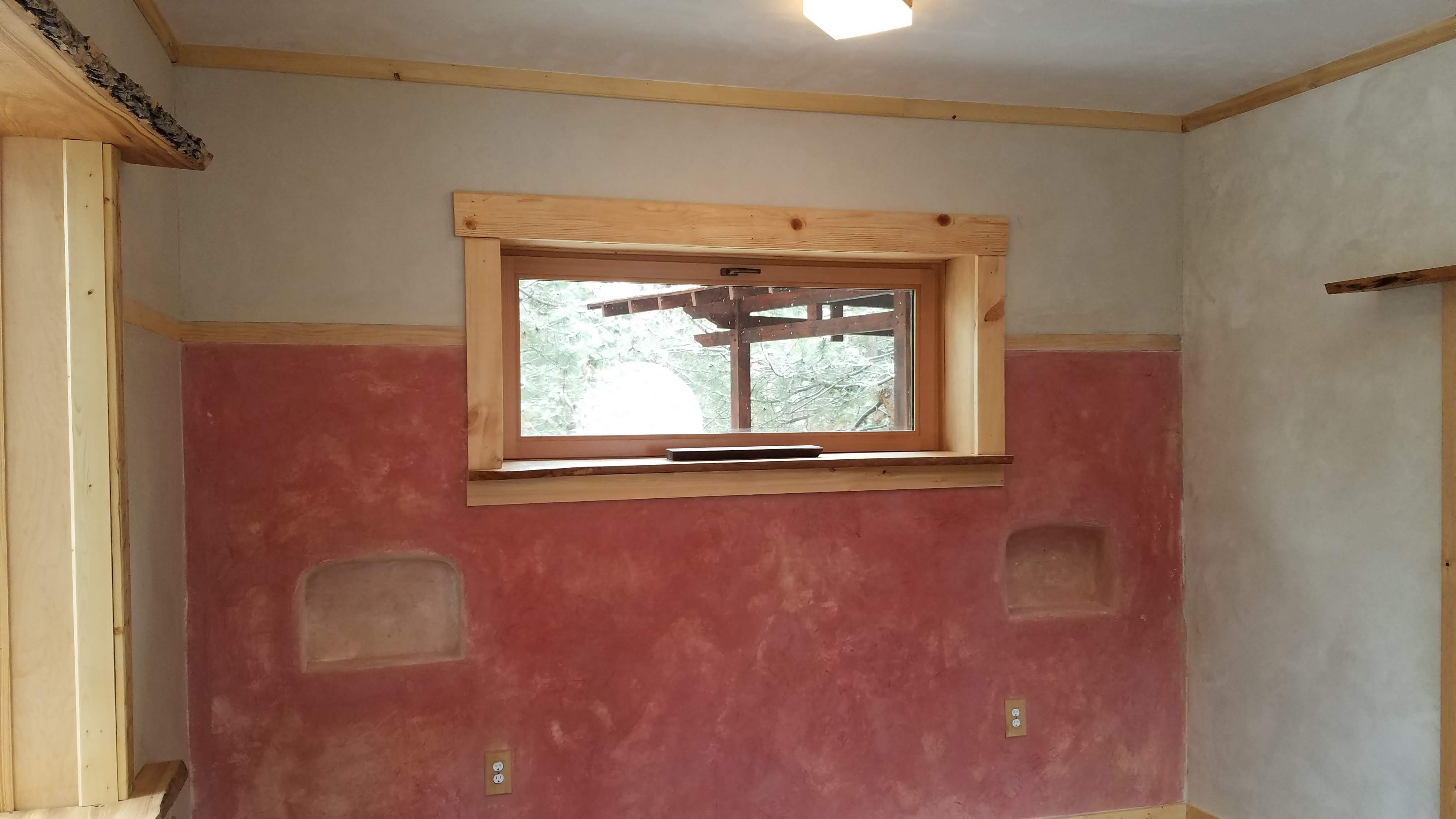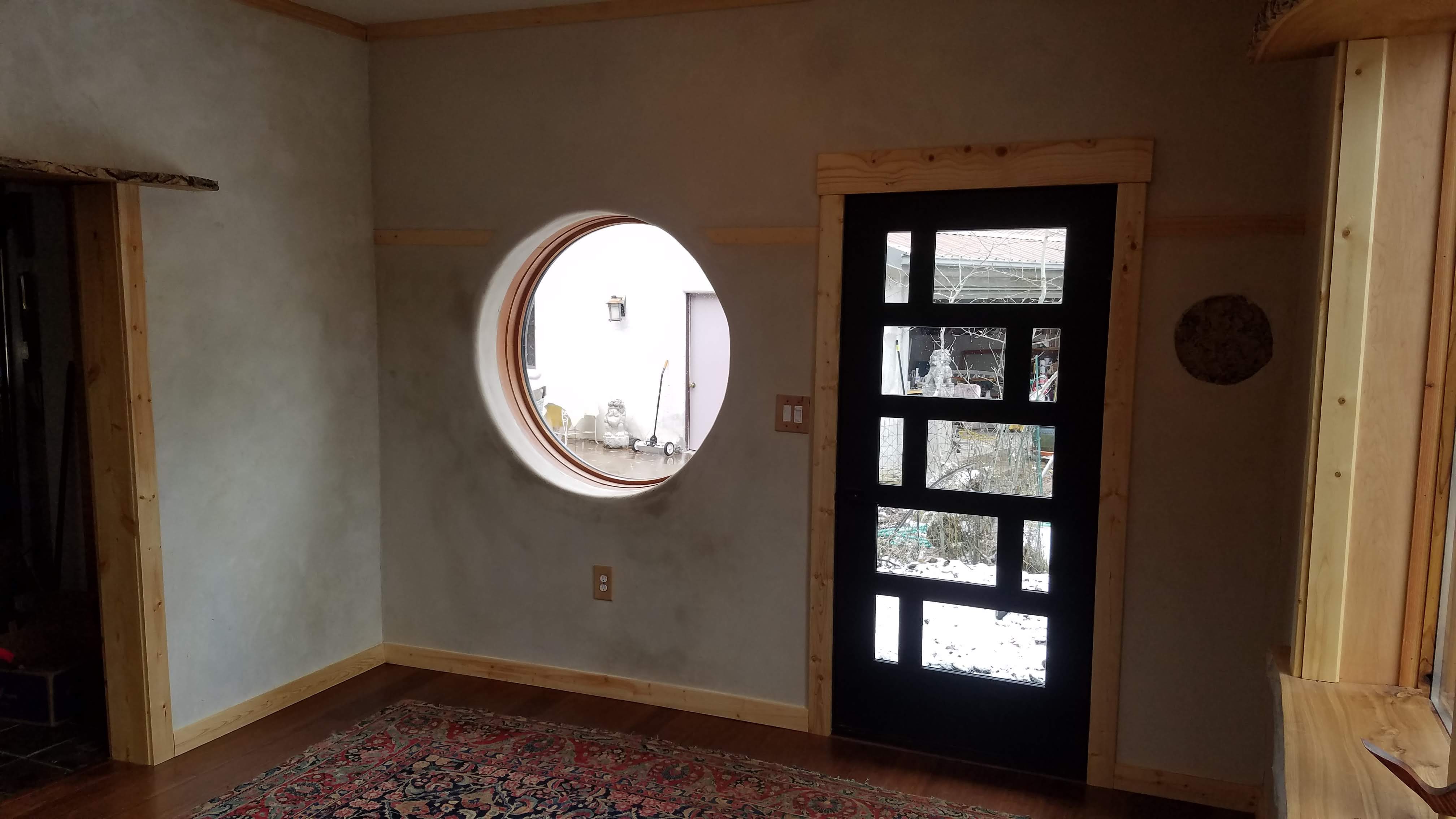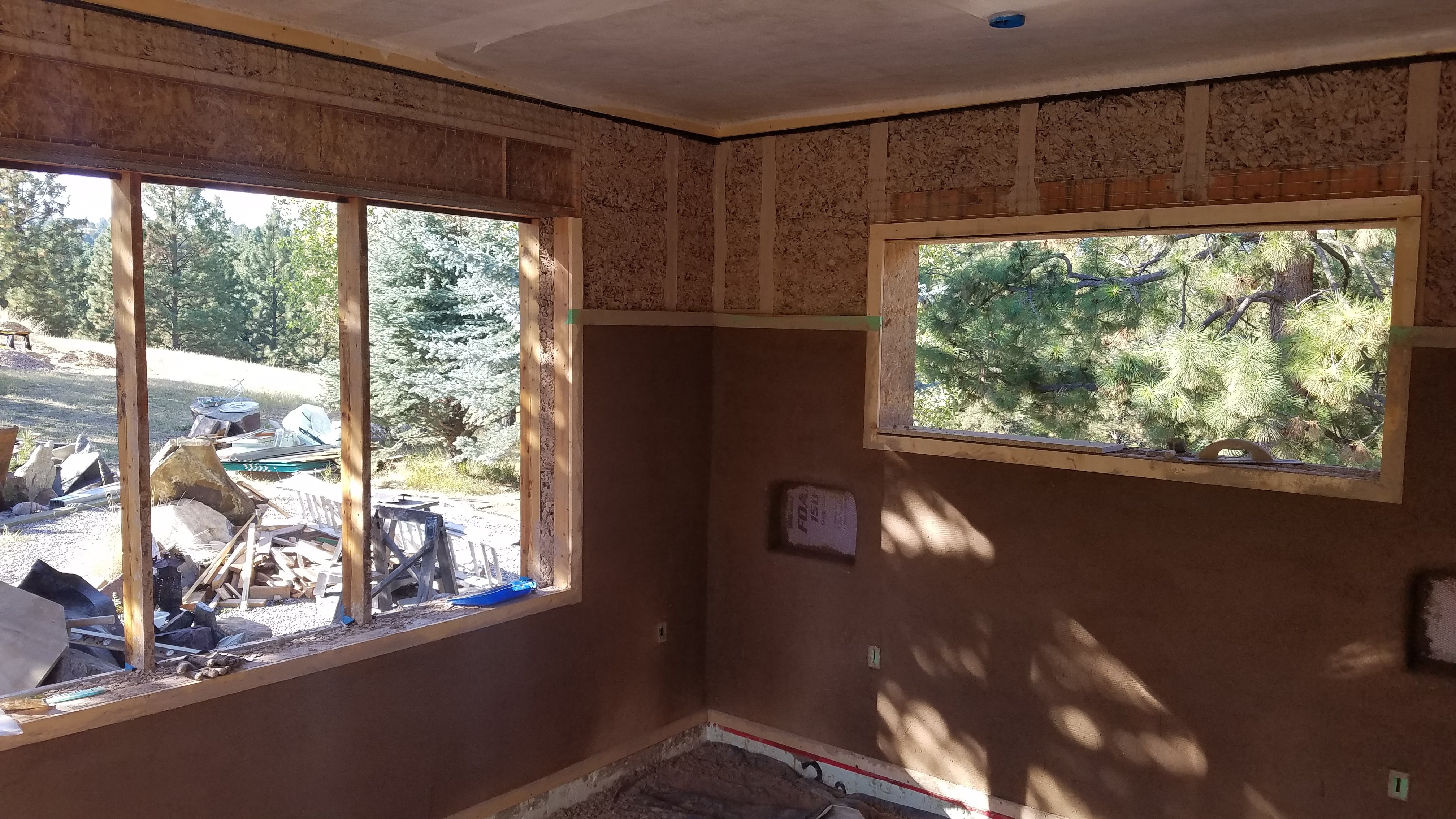The foundation and parts of the walls used Faswall Insulated Concrete forms, a product made with minerized wood chips from recycled pallets. Infill of light framing with double stud walls and infilled with light earth or light clay was used with locally ground pallets and local clay. Finish renders were lime straw renders in the root celar, and local clay, sand and fiber (horse manure) for the upper portions. We also clad the base with recycled granite slices and recycled composite shake as a rain skirt. The four foot eaves keep all of the summer sun out of the windows and create good protection for the clay finished walls and create a 308 sq ft rooftop space above the 140 sq ft footprint.