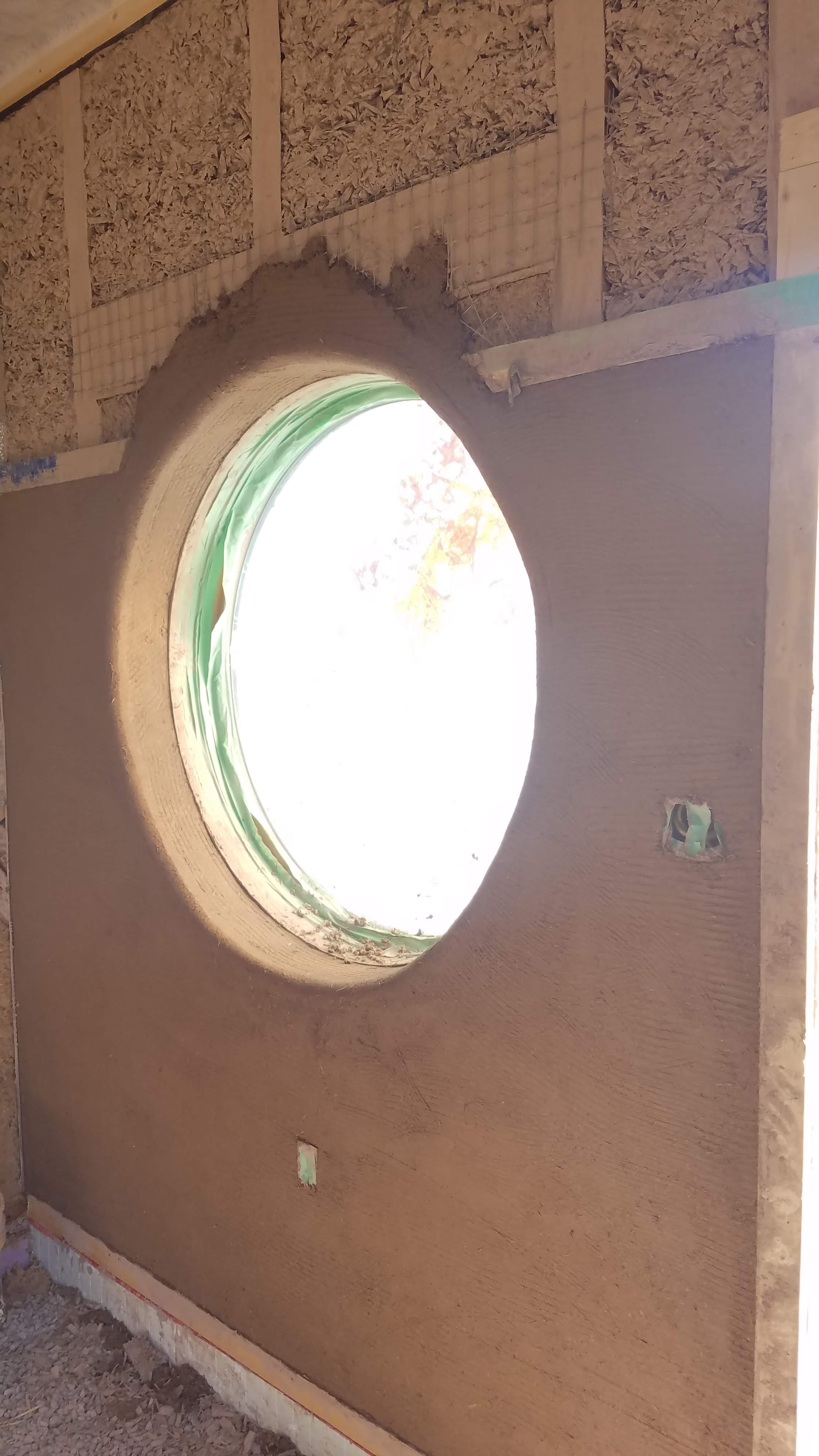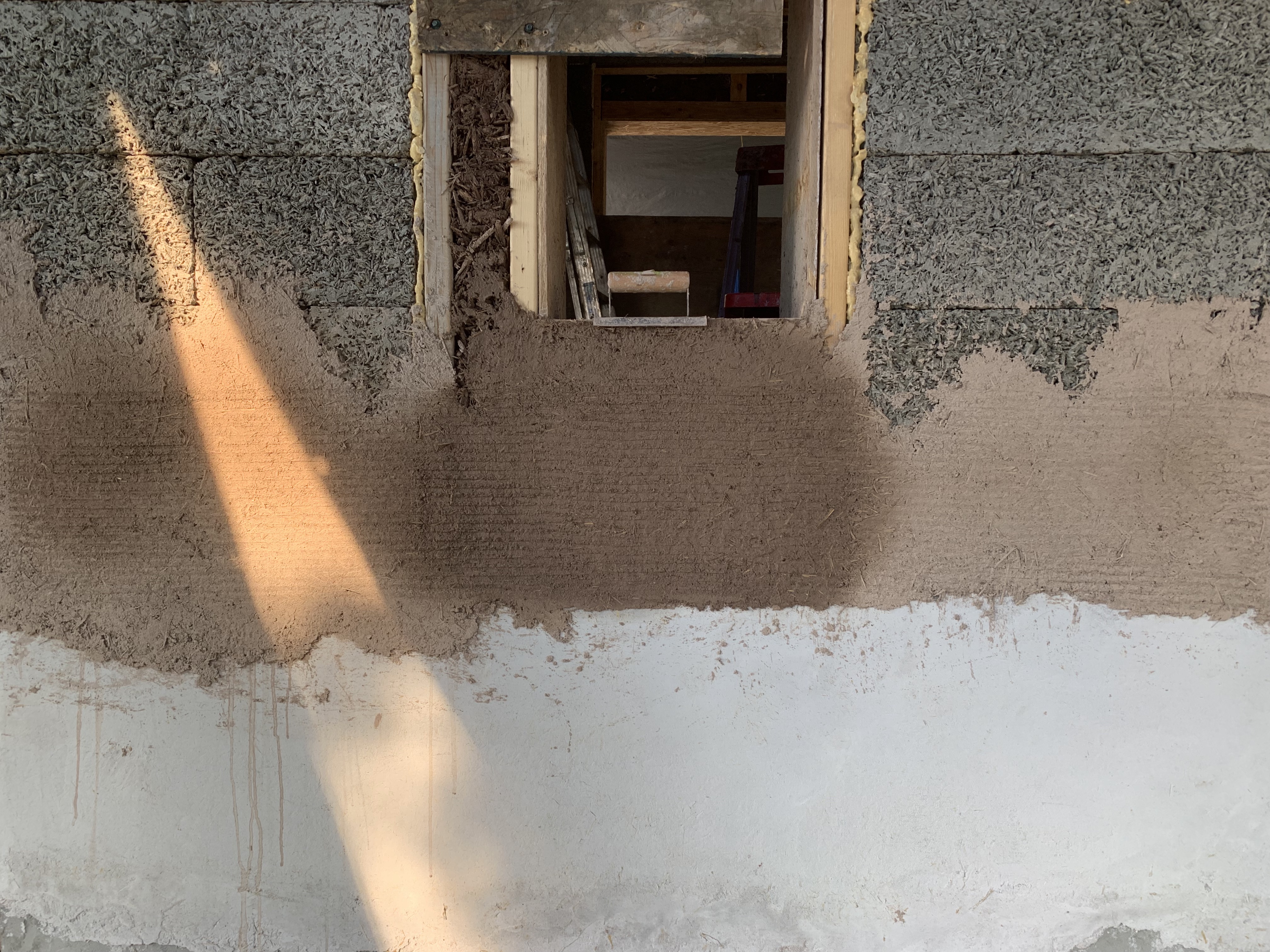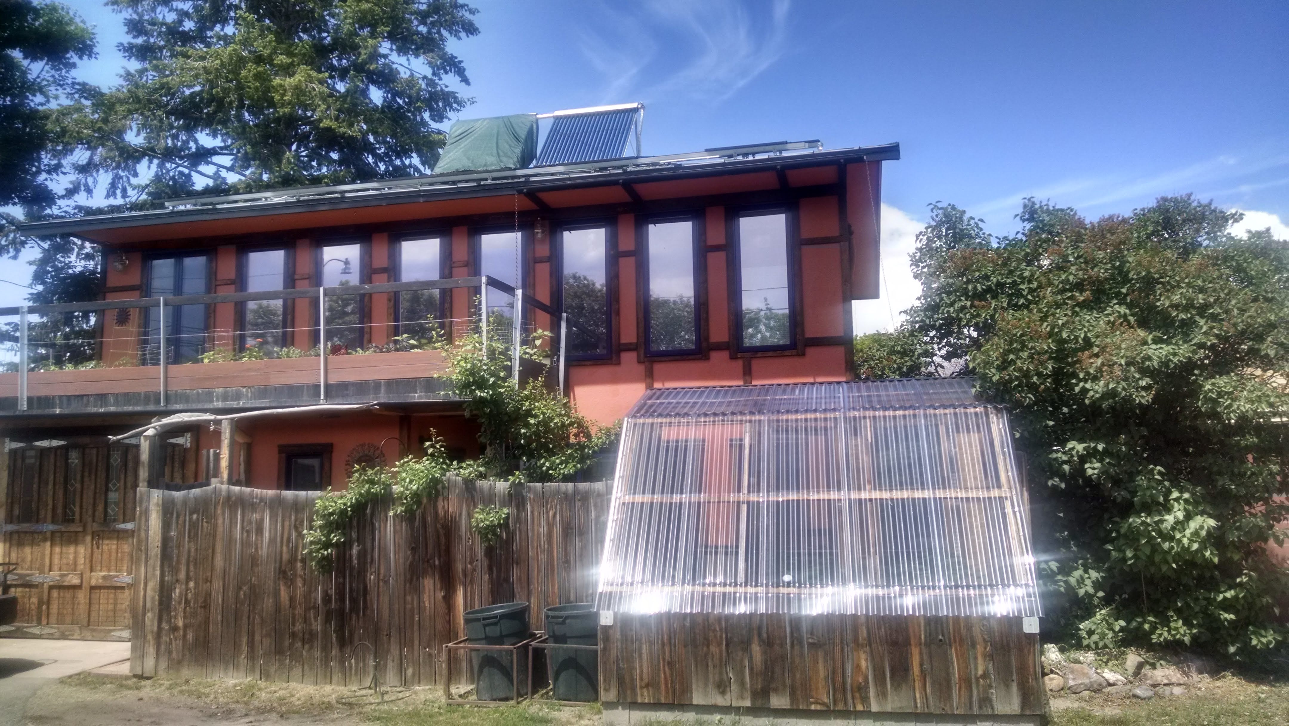 The foundation and parts of the walls used Faswall Insulated Concrete forms, a product made with minerized wood chips from recycled pallets. Infill of light framing with double stud walls and infilled with light earth or light clay was used with locally ground pallets and local clay. Finish renders were lime straw renders in the root celar, and local clay, sand and fiber (horse manure) for the upper portions. We also clad the base with recycled granite slices and recycled composite shake as a rain skirt. The four foot eaves keep all of the summer sun out of the windows and create good protection for the clay finished walls and create a 308 sq ft rooftop space above the 140 sq ft footprint.