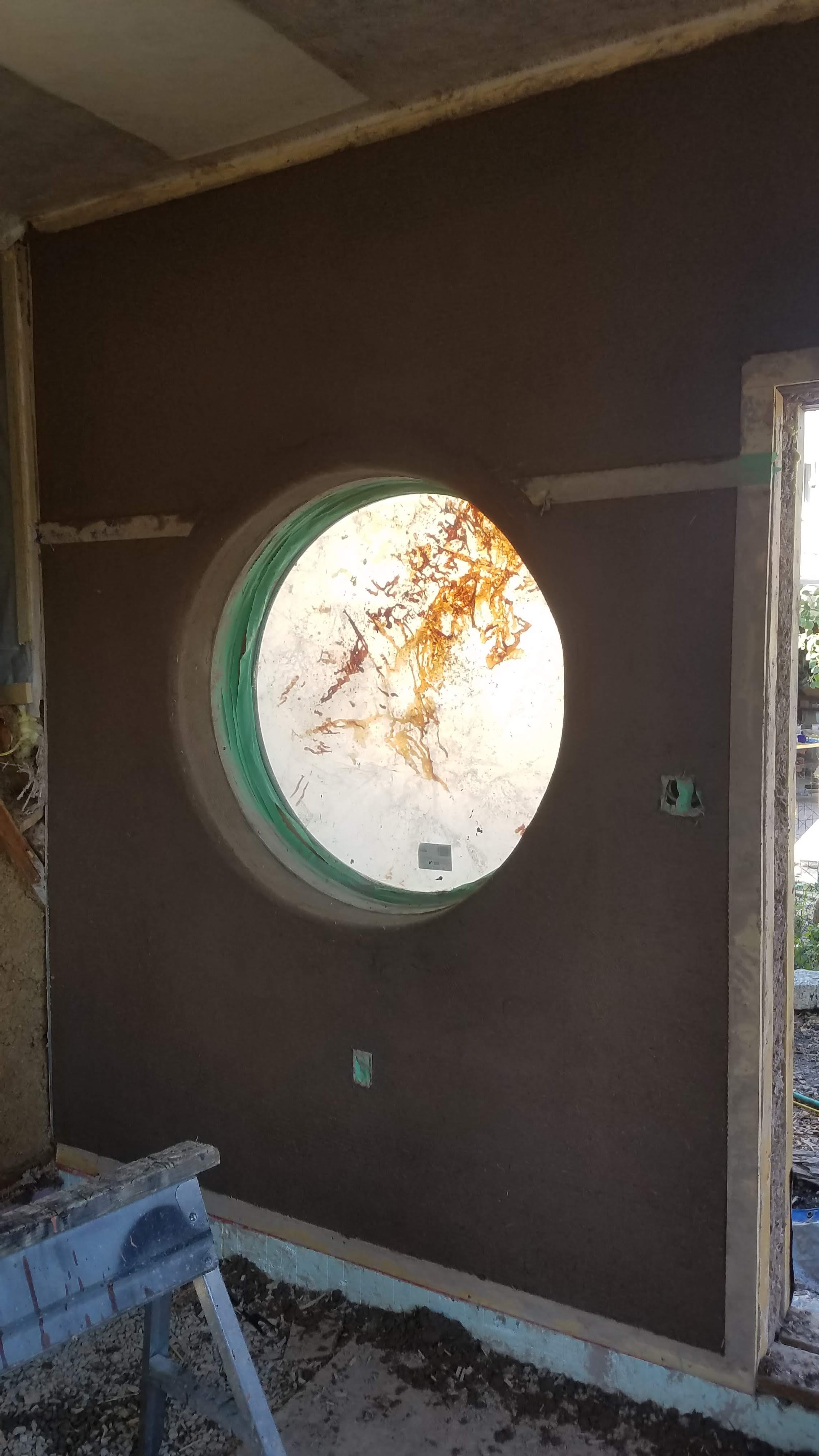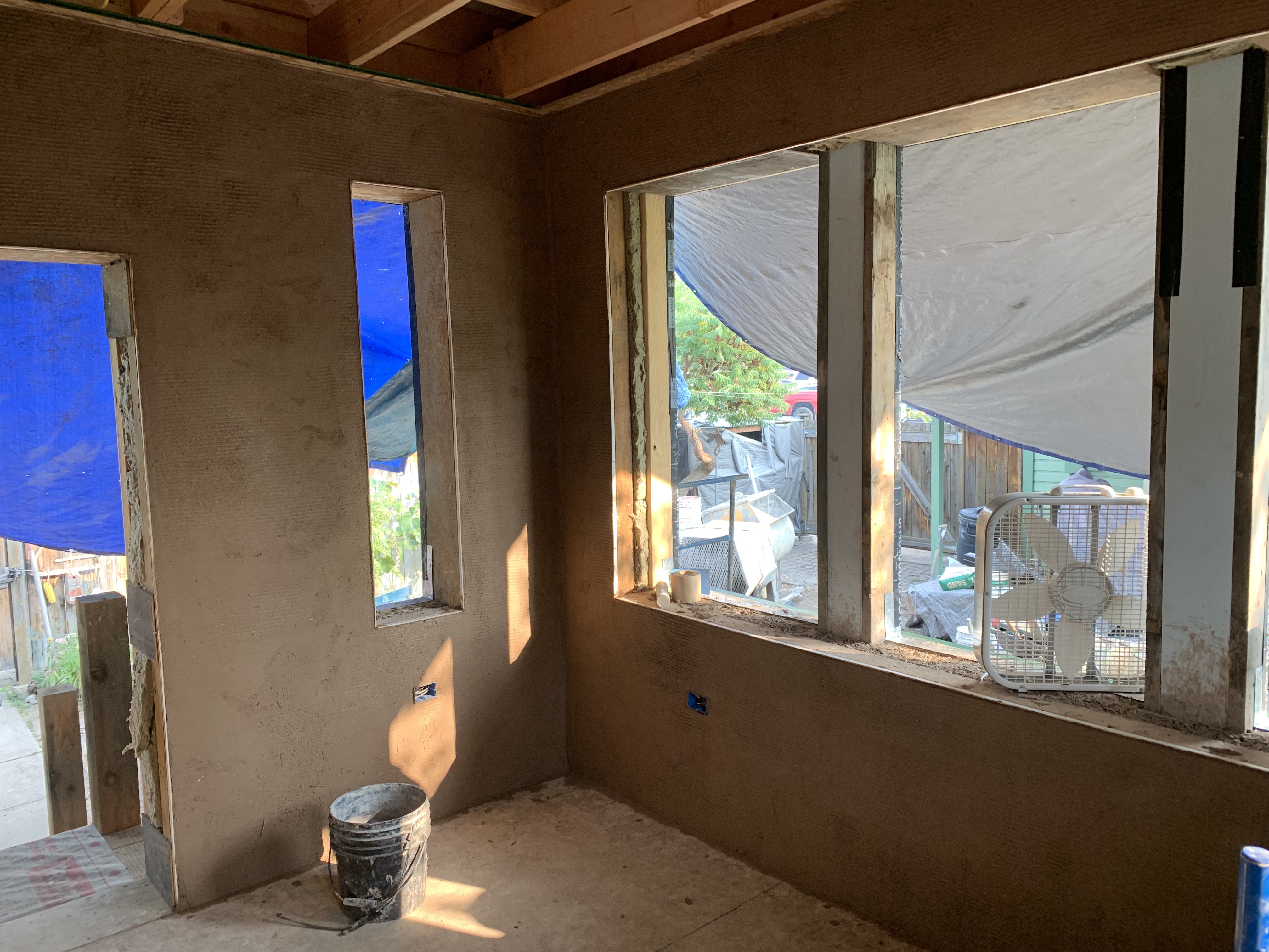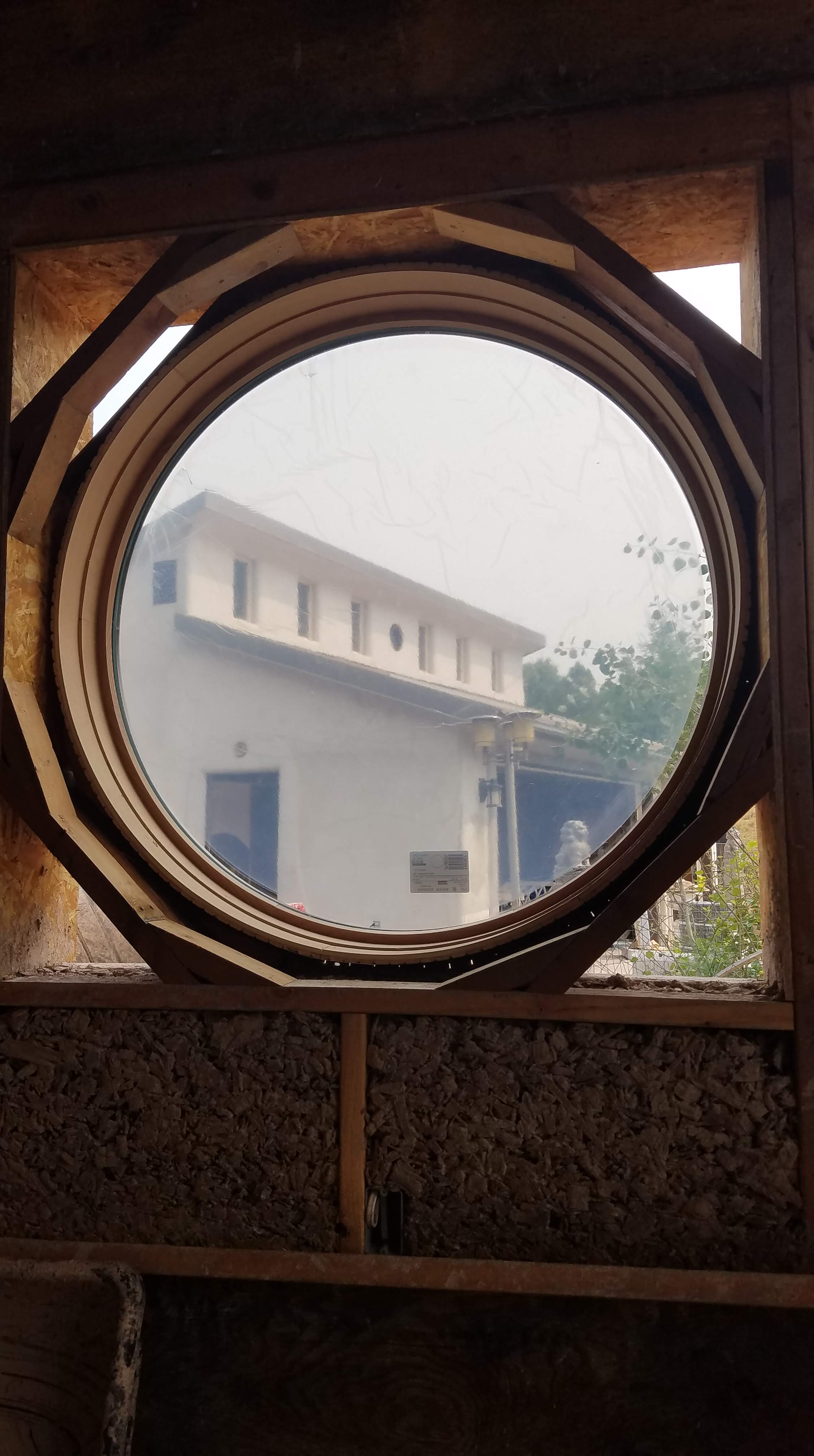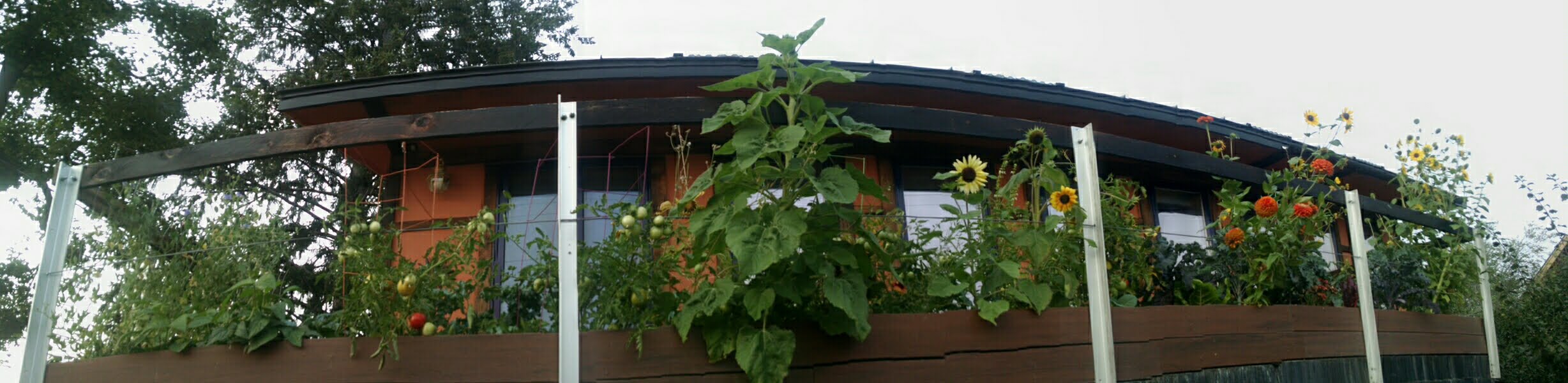 The foundation and parts of the walls used Faswall Insulated Concrete forms, a product made with minerized wood chips from recycled pallets. Infill of light framing with double stud walls and infilled with light earth or light clay was used with locally ground pallets and local clay. Finish renders were lime straw renders in the root celar, and local clay, sand and fiber (horse manure) for the upper portions. We also clad the base with recycled granite slices and recycled composite shake as a rain skirt. The four foot eaves keep all of the summer sun out of the windows and create good protection for the clay finished walls and create a 308 sq ft rooftop space above the 140 sq ft footprint.