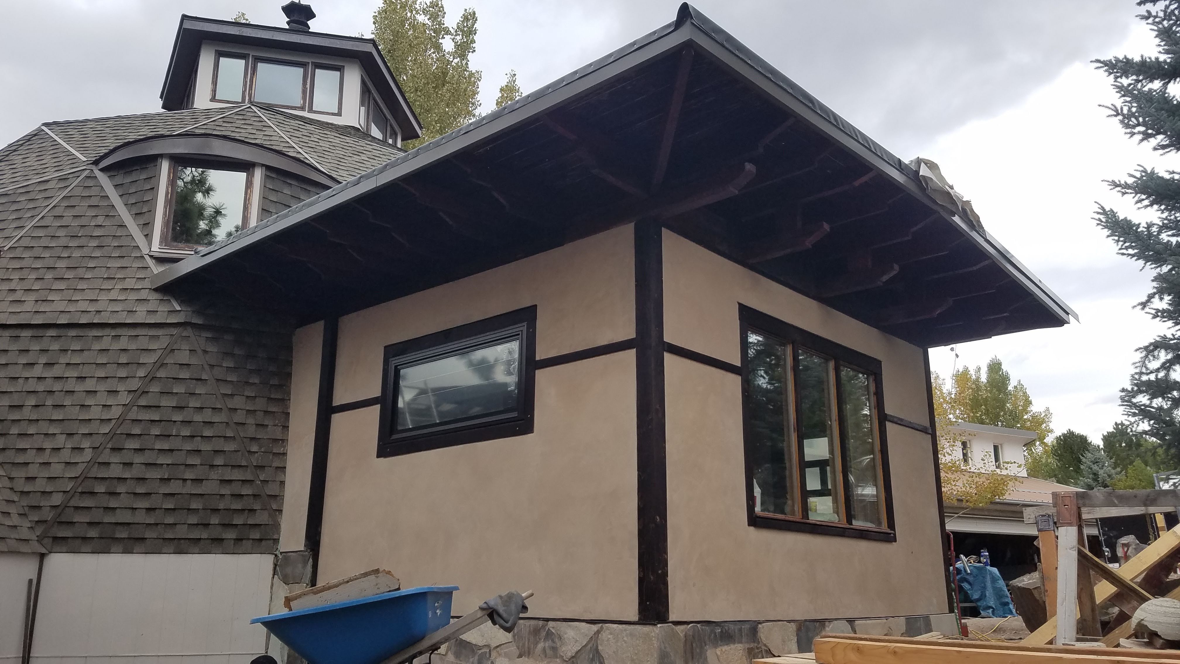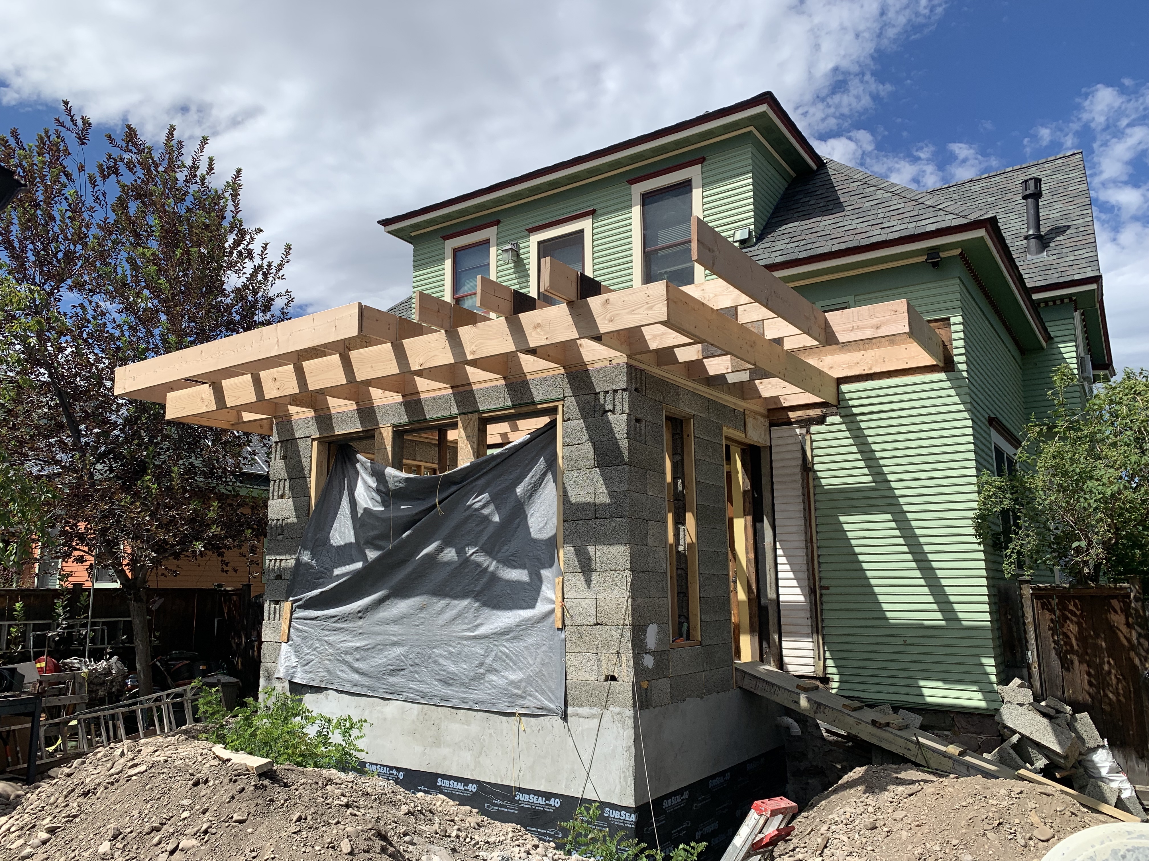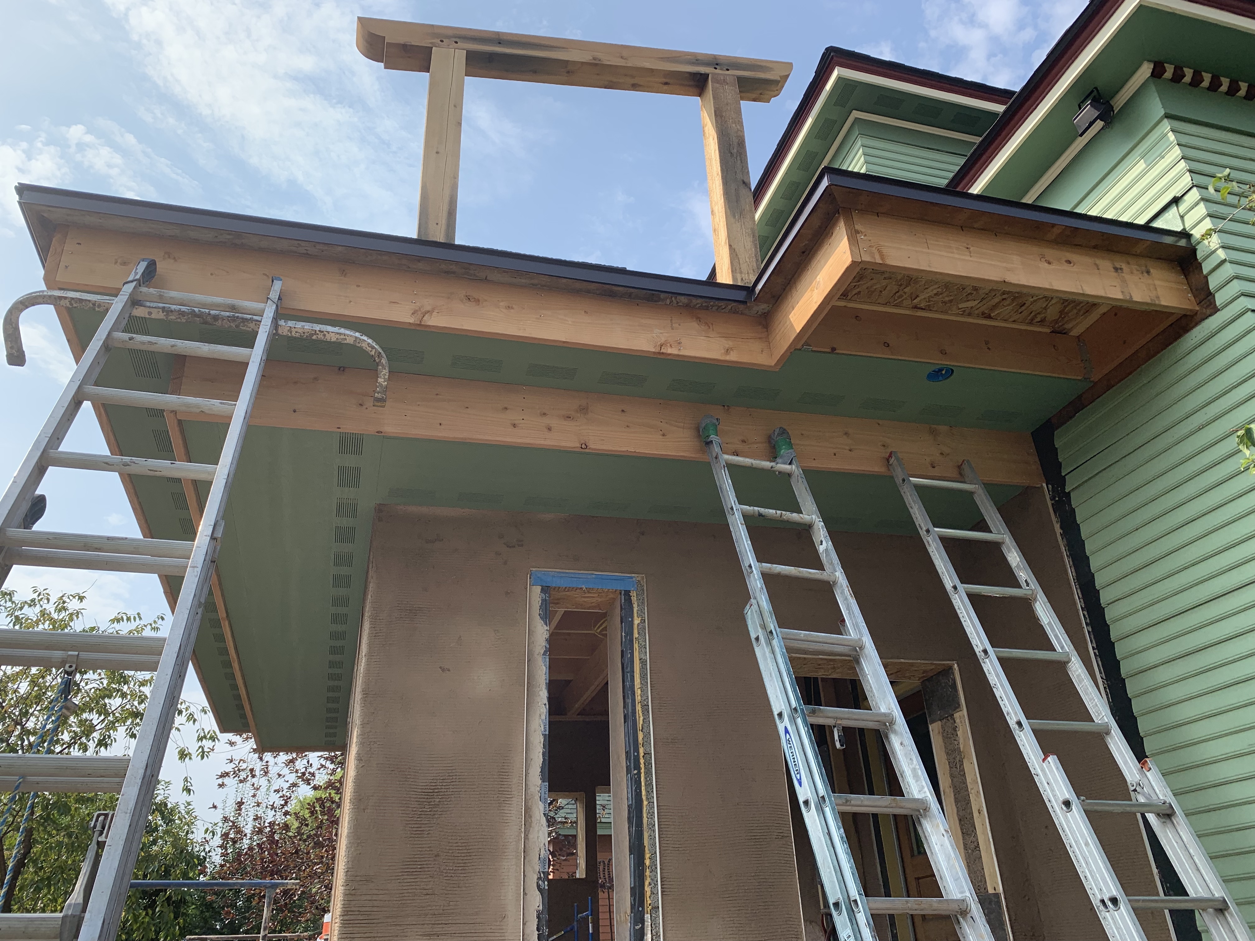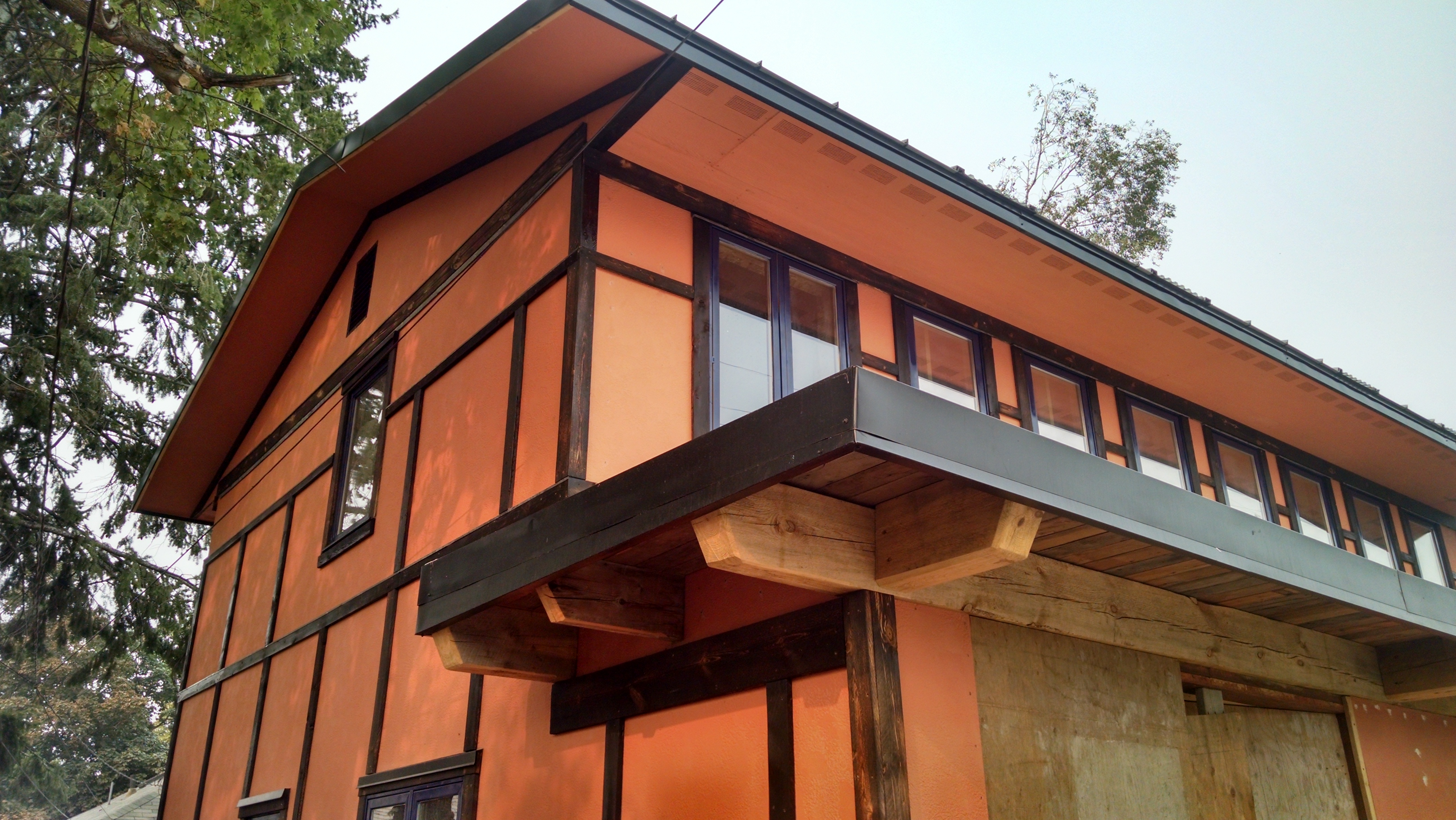The roof and wall structure repurposed nearly all of the “waste” from a covered deck and porch roof that was on the location as well as material for forms, scaffold, and timber framing of the corbel trusses.