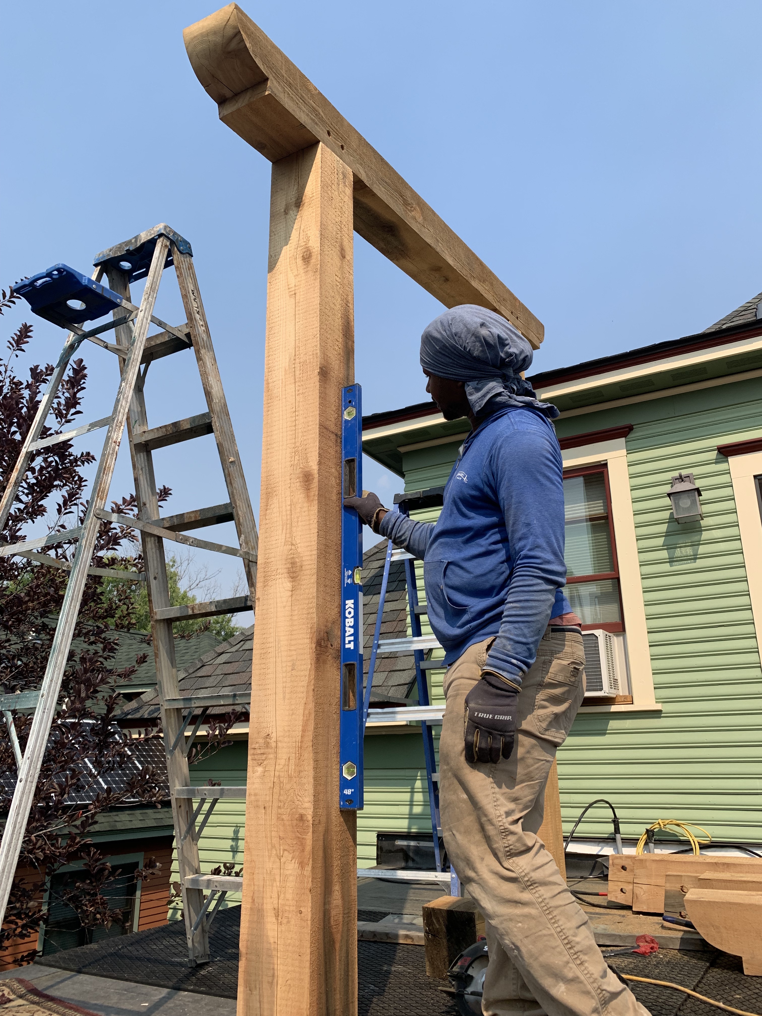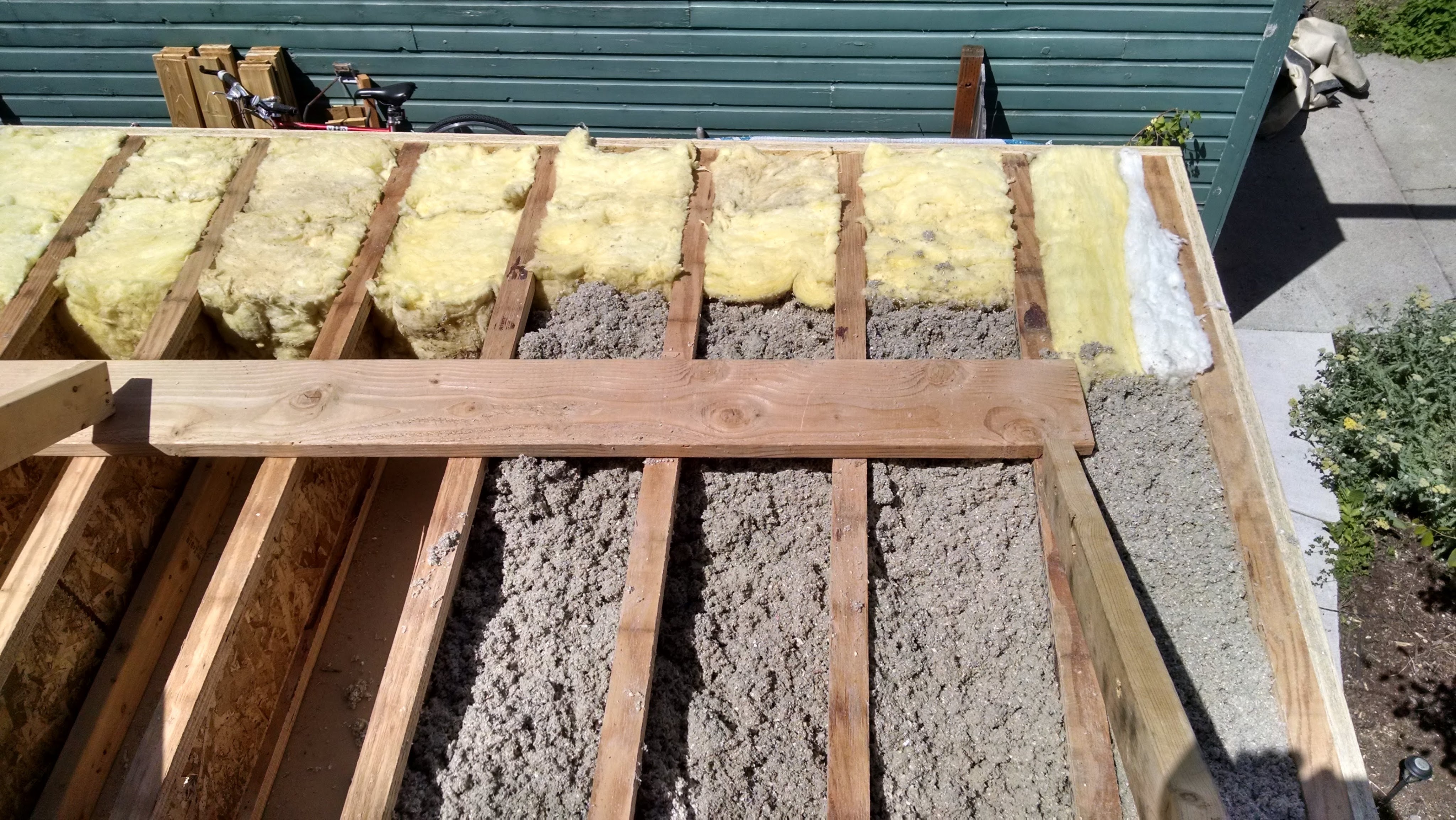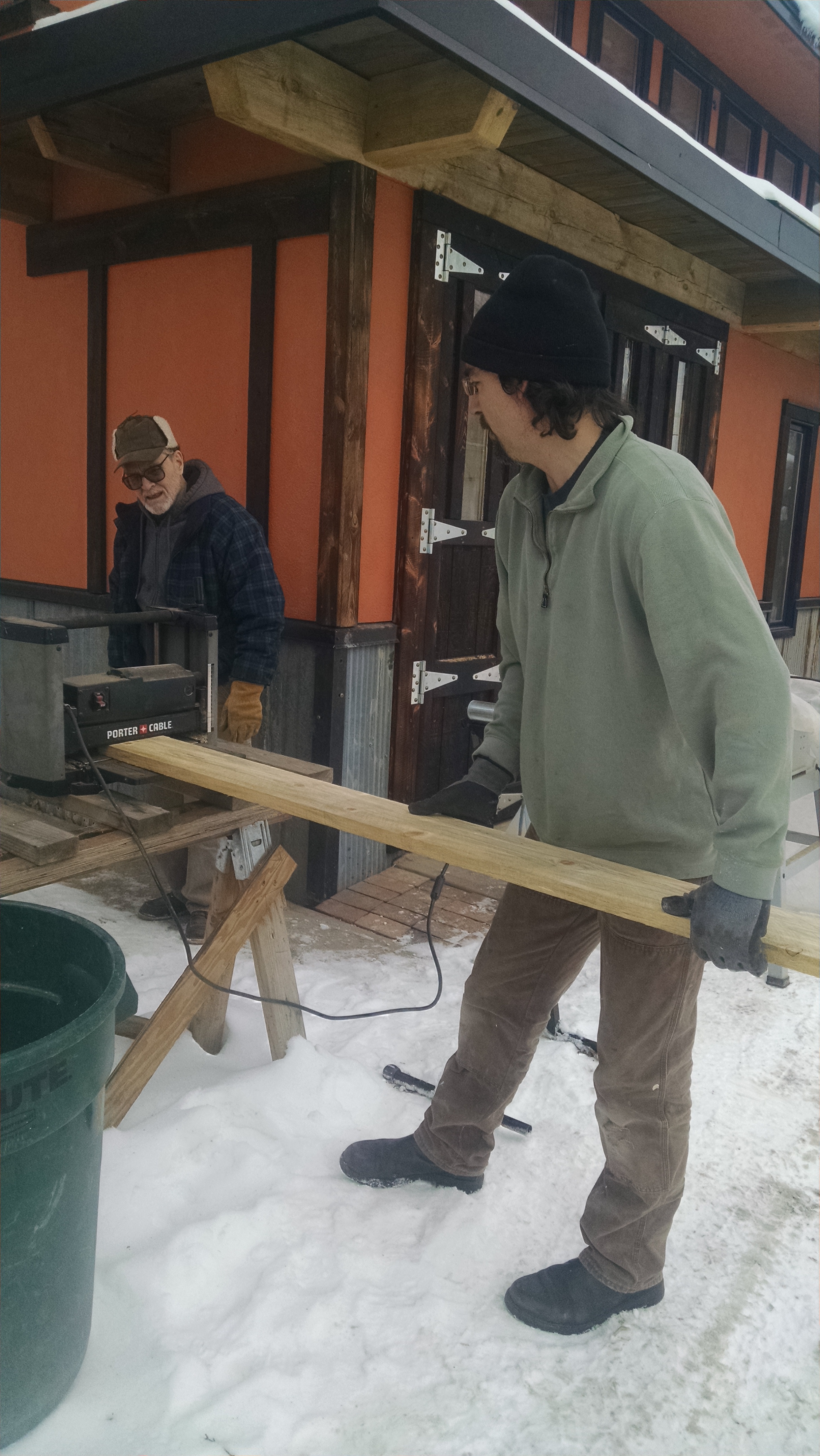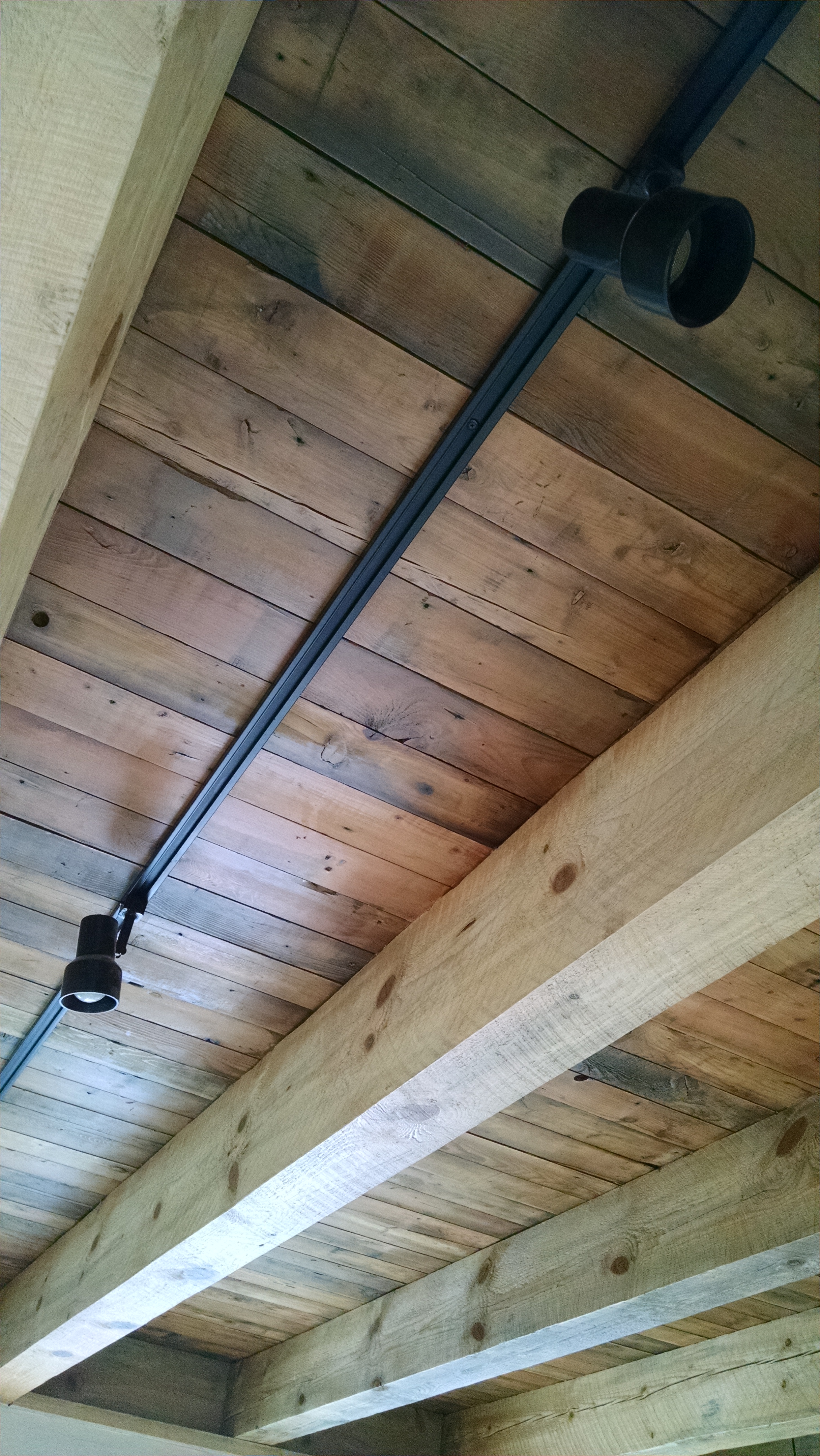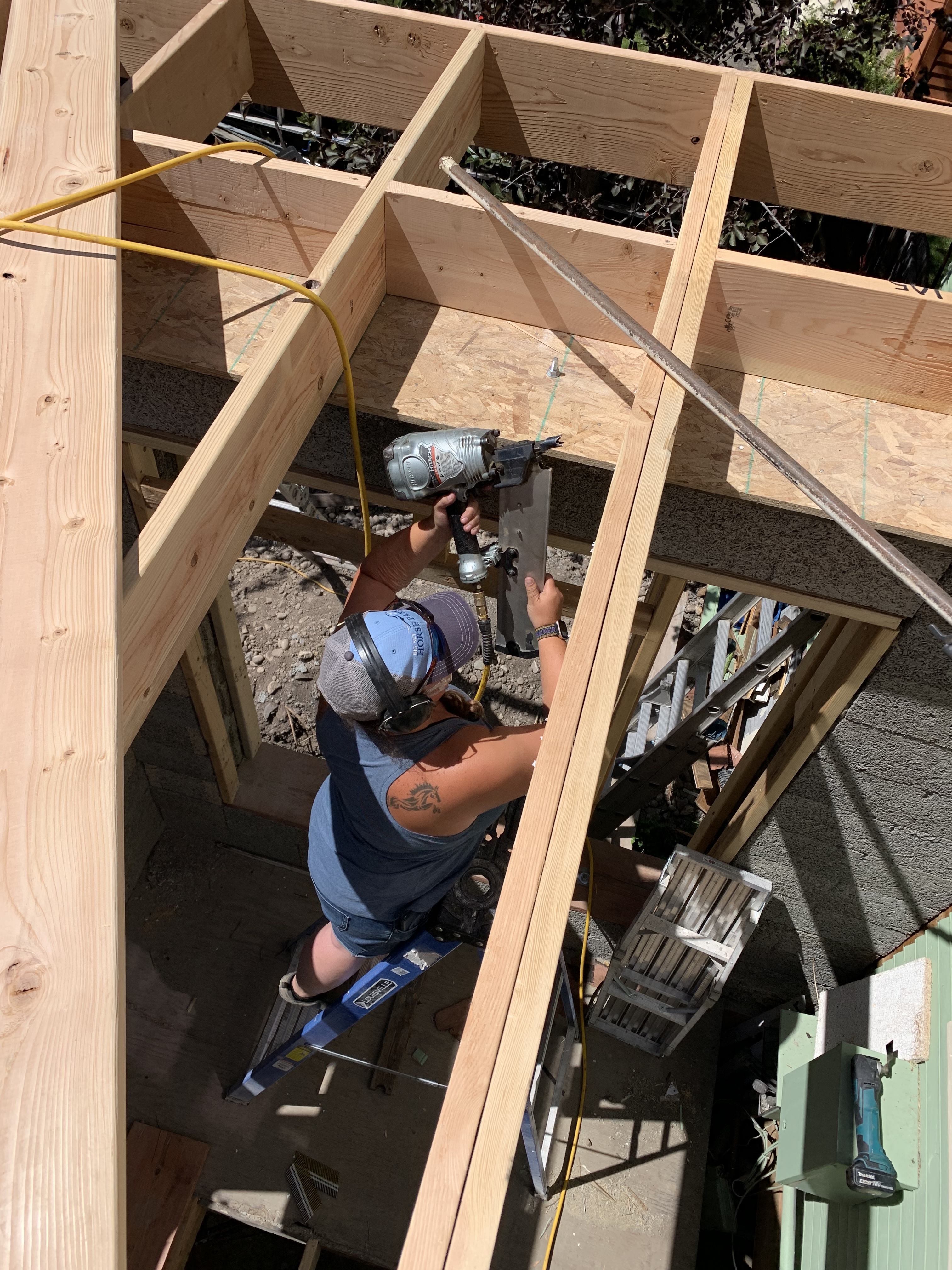The roof and wall structure repurposed nearly all of the “waste” from a covered deck and porch roof that was on the location as well as material for forms, scaffold, and timber framing of the corbel trusses.