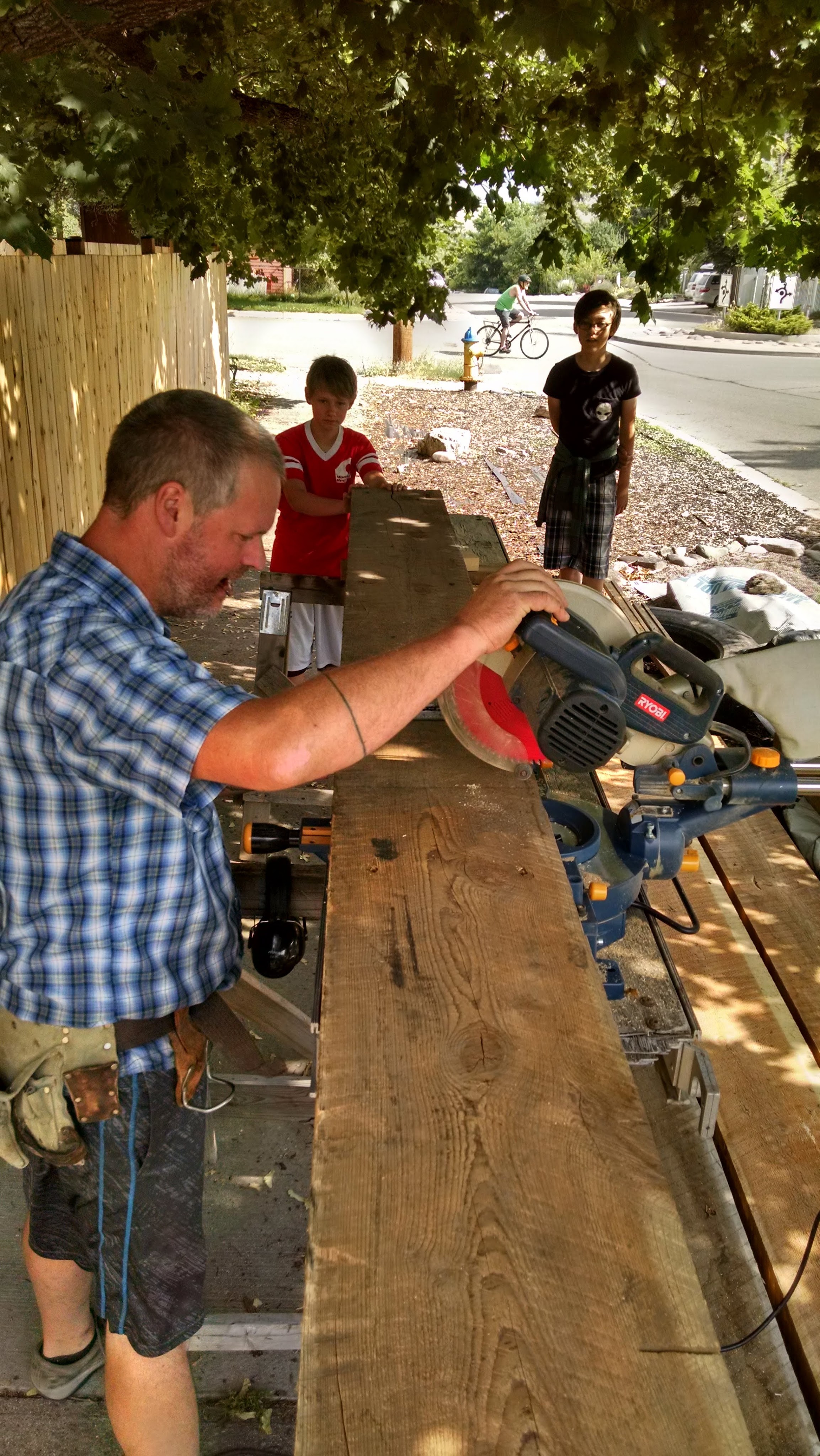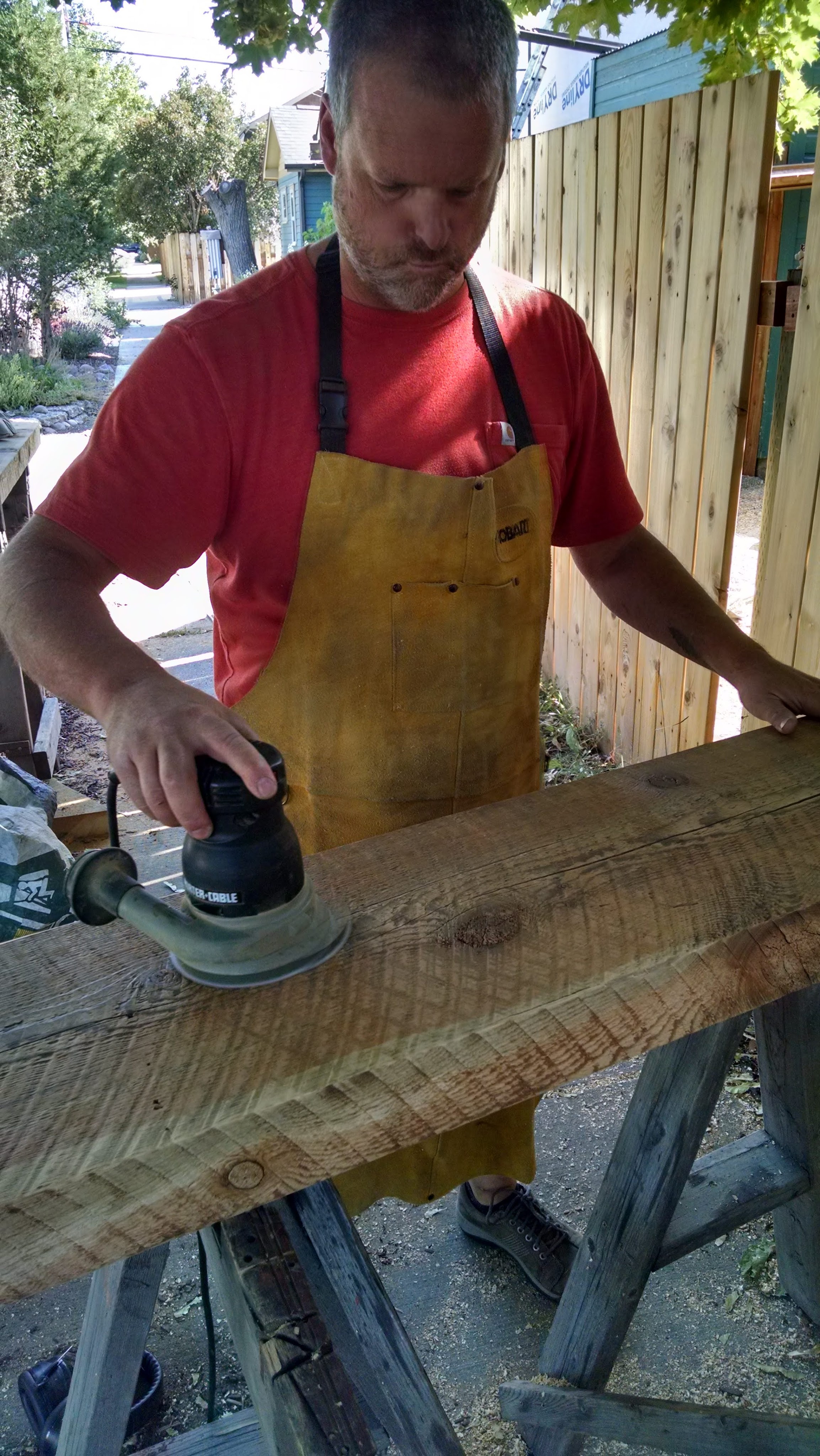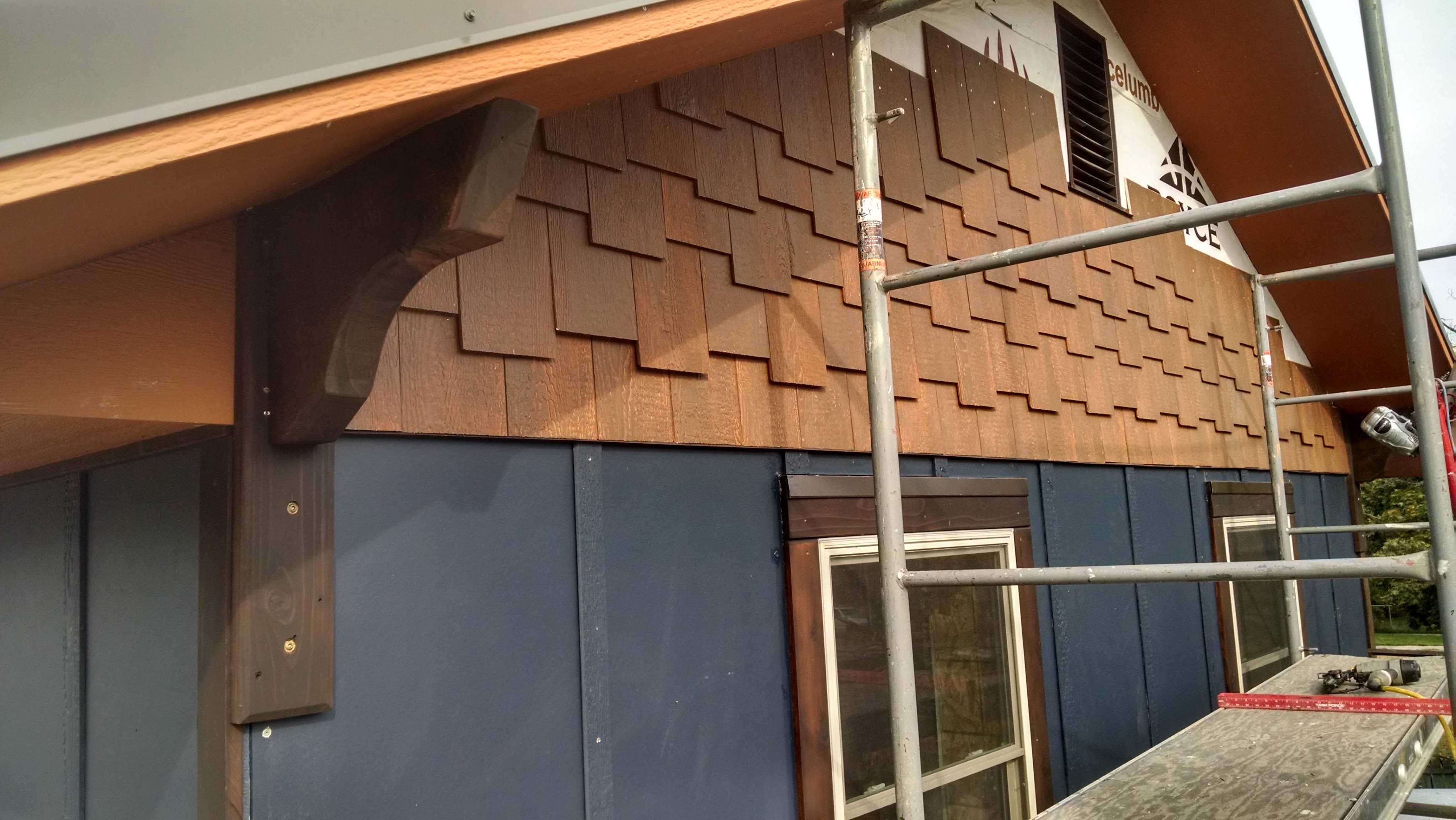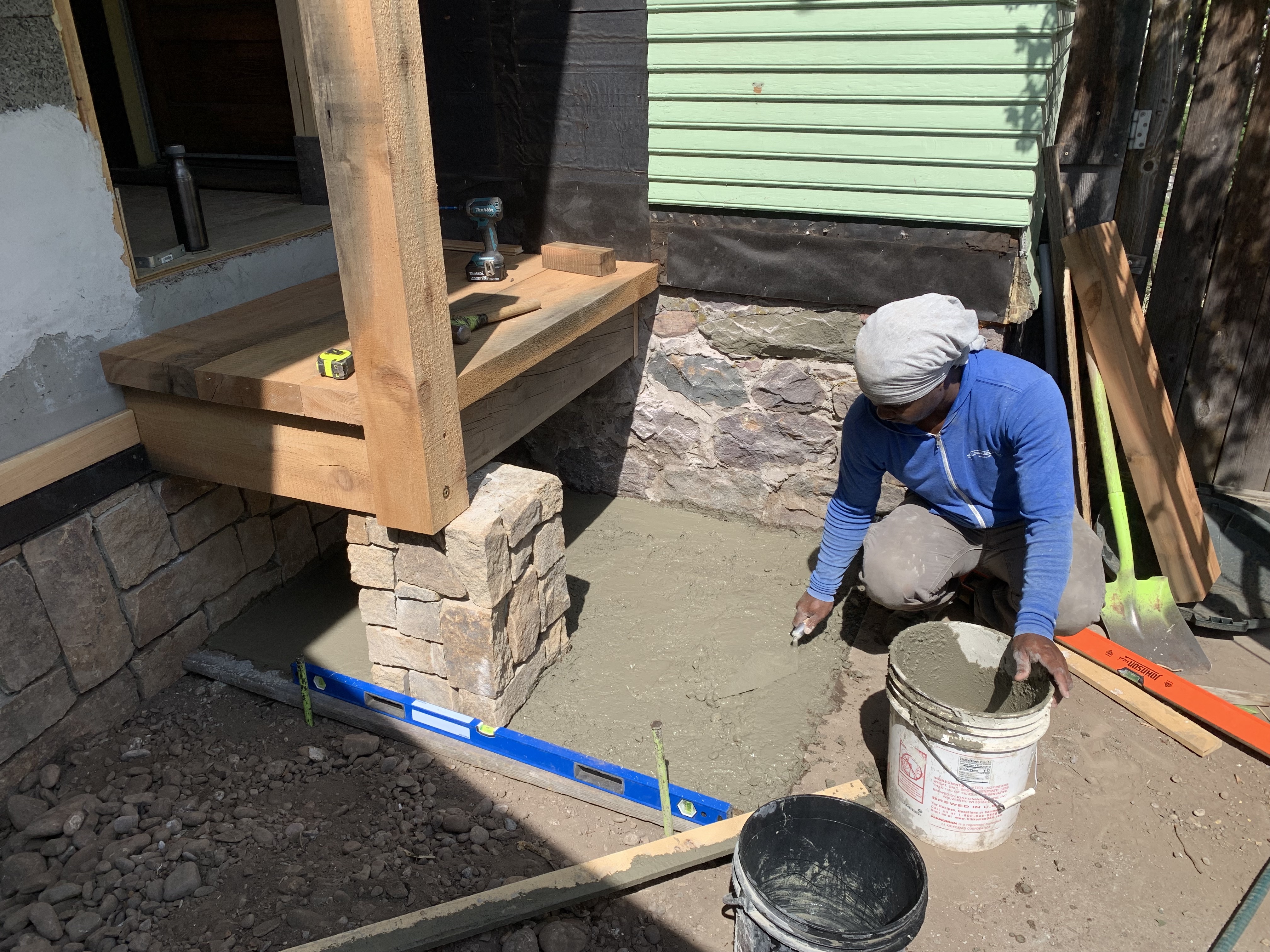 The roof and wall structure repurposed nearly all of the “waste” from a covered deck and porch roof that was on the location as well as material for forms, scaffold, and timber framing of the corbel trusses.