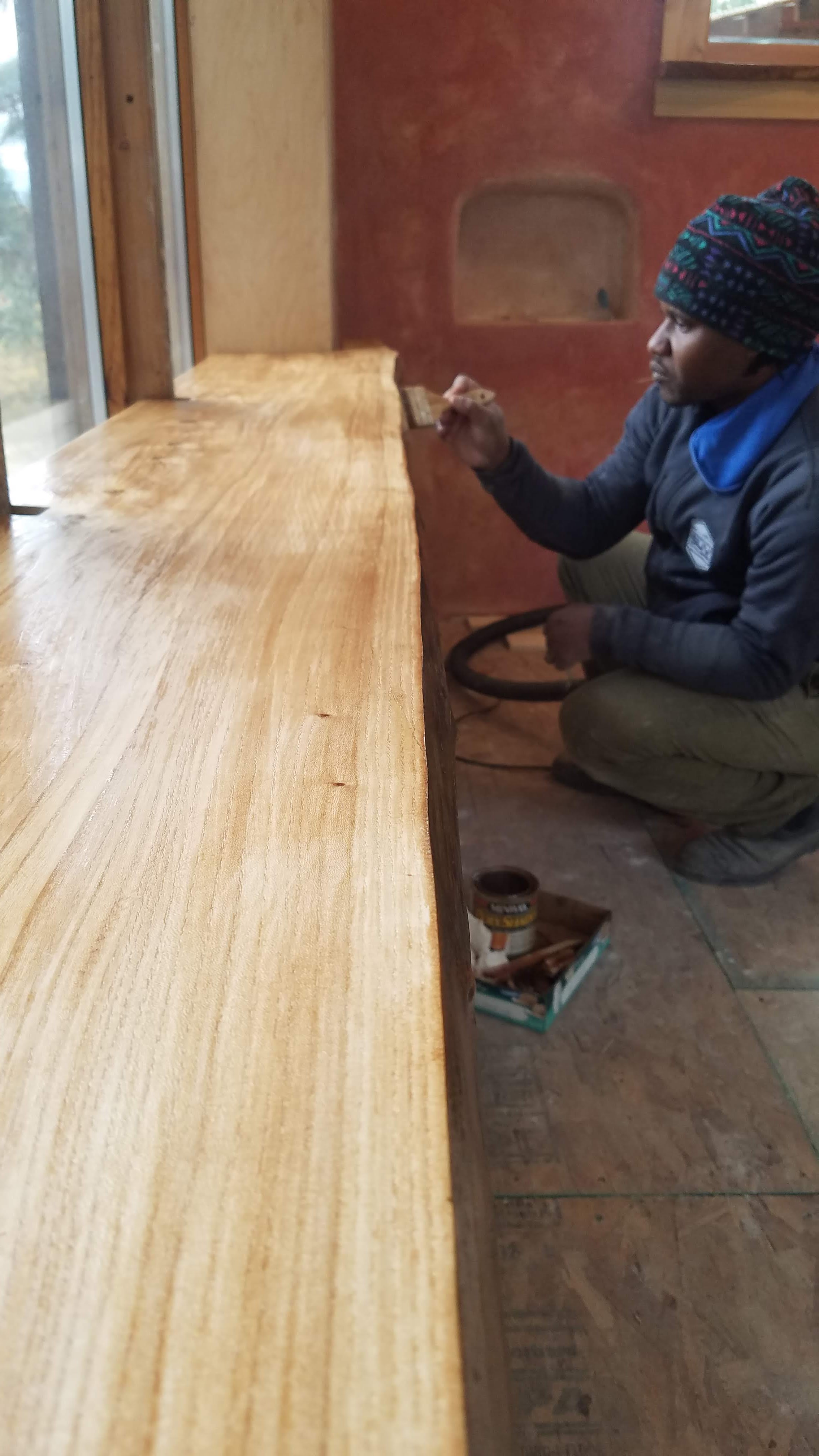 The walls are plastered in clay, sand, fiber stucco and protected by 4′ roof overhangs and plaster starts 18″ above grade. The epdm roof is uv protected by local stone ballast and recycled steel stud gravel stops.
