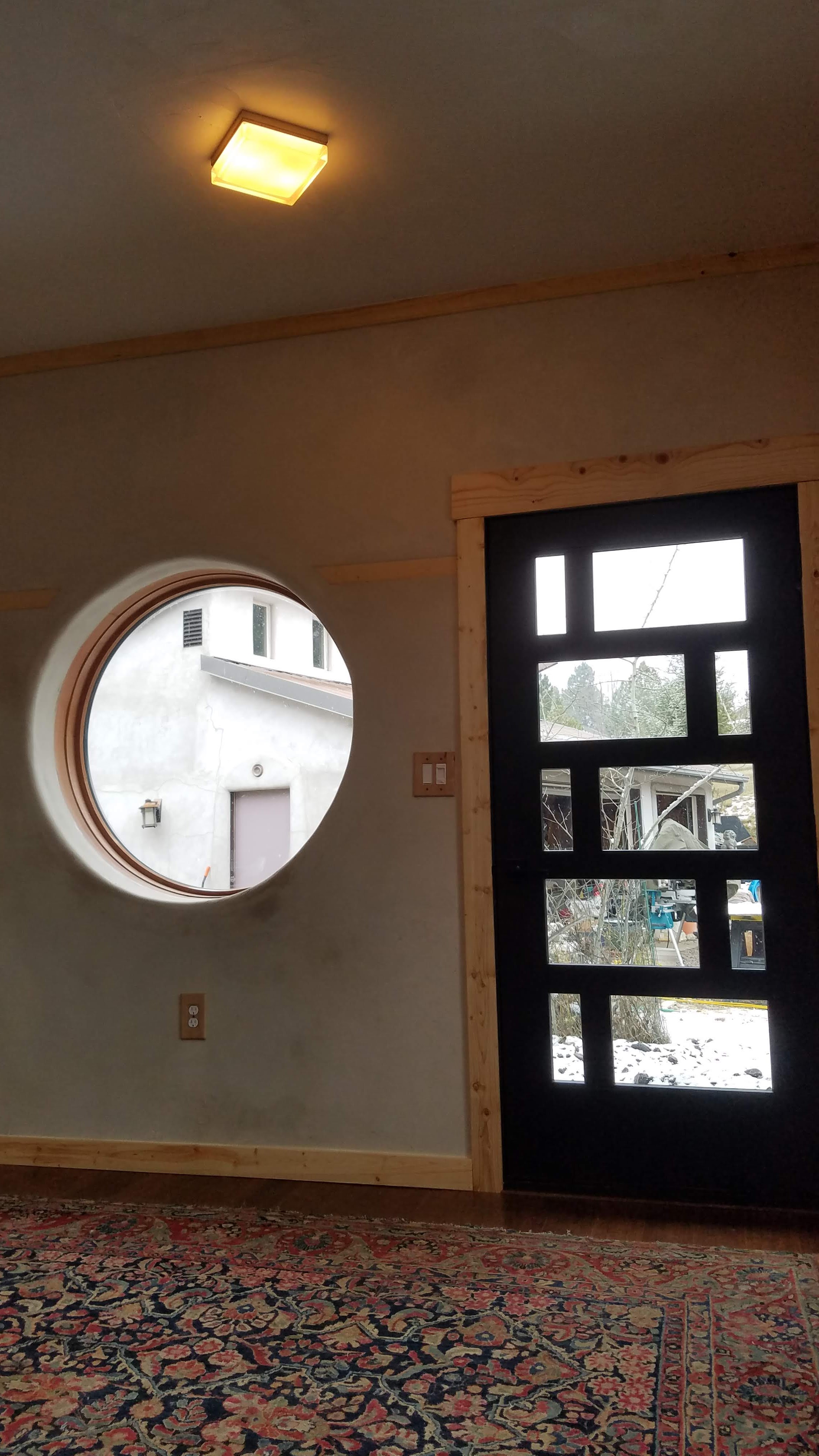 This natural building project has countless bioregional design principles namely the “Light Clay, or Light Earth” wall system, sometimes referred to as LSC (Light straw Clay) or Chip and Slip. In this instance the technique uses wood chip waste from artisan lumber mills and local clay soil from the valley to create dense packed monolithic, alumina silicate and cellulose insulated mass walls in a standard advanced framing double stud wall 12 inches thick. It is similar to rammed earth in technique but it has a high insulation value, is breathable, fire resistant, and has light framing wrapped in the mass wall.