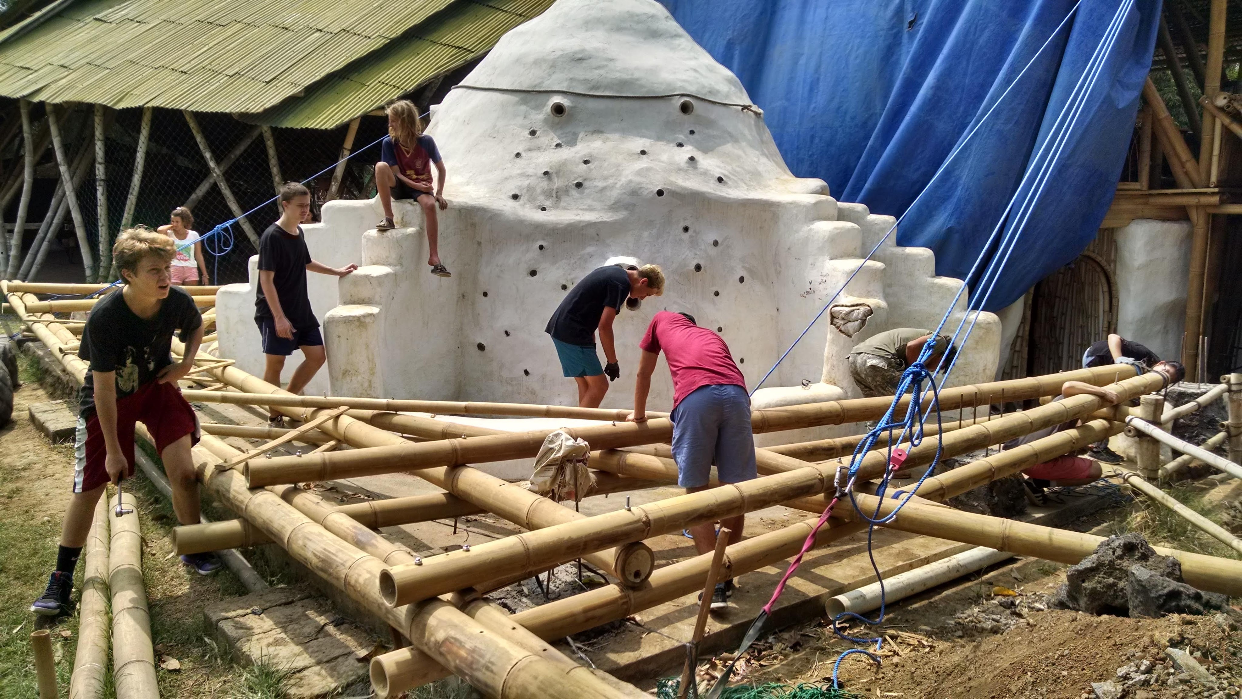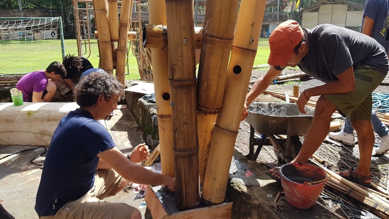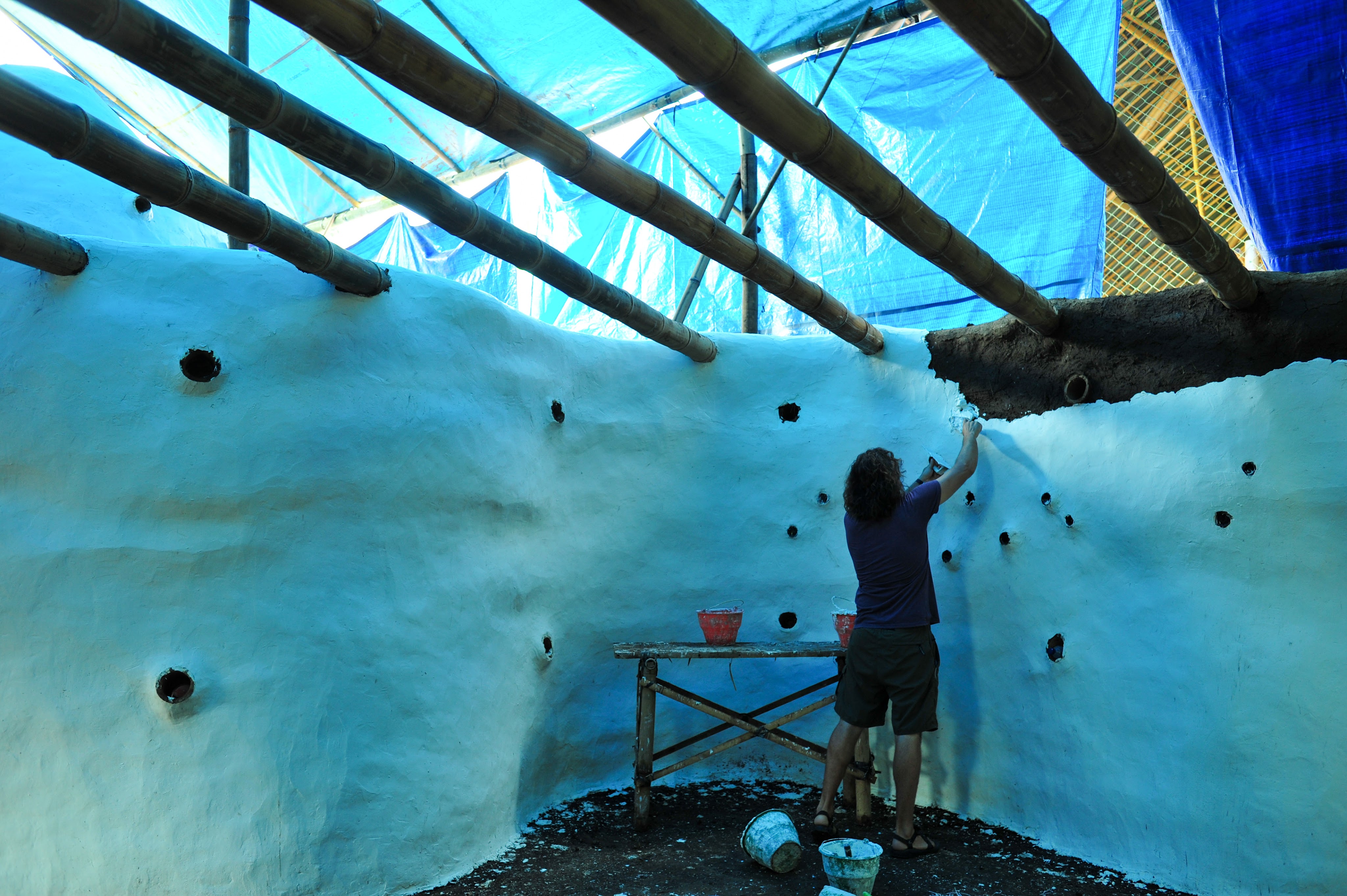 The technique can be used to create whole structures like the dome, or part of a building like the Media Arts Lab, that supported a bamboo second story and a roof for solar panels and water collection.