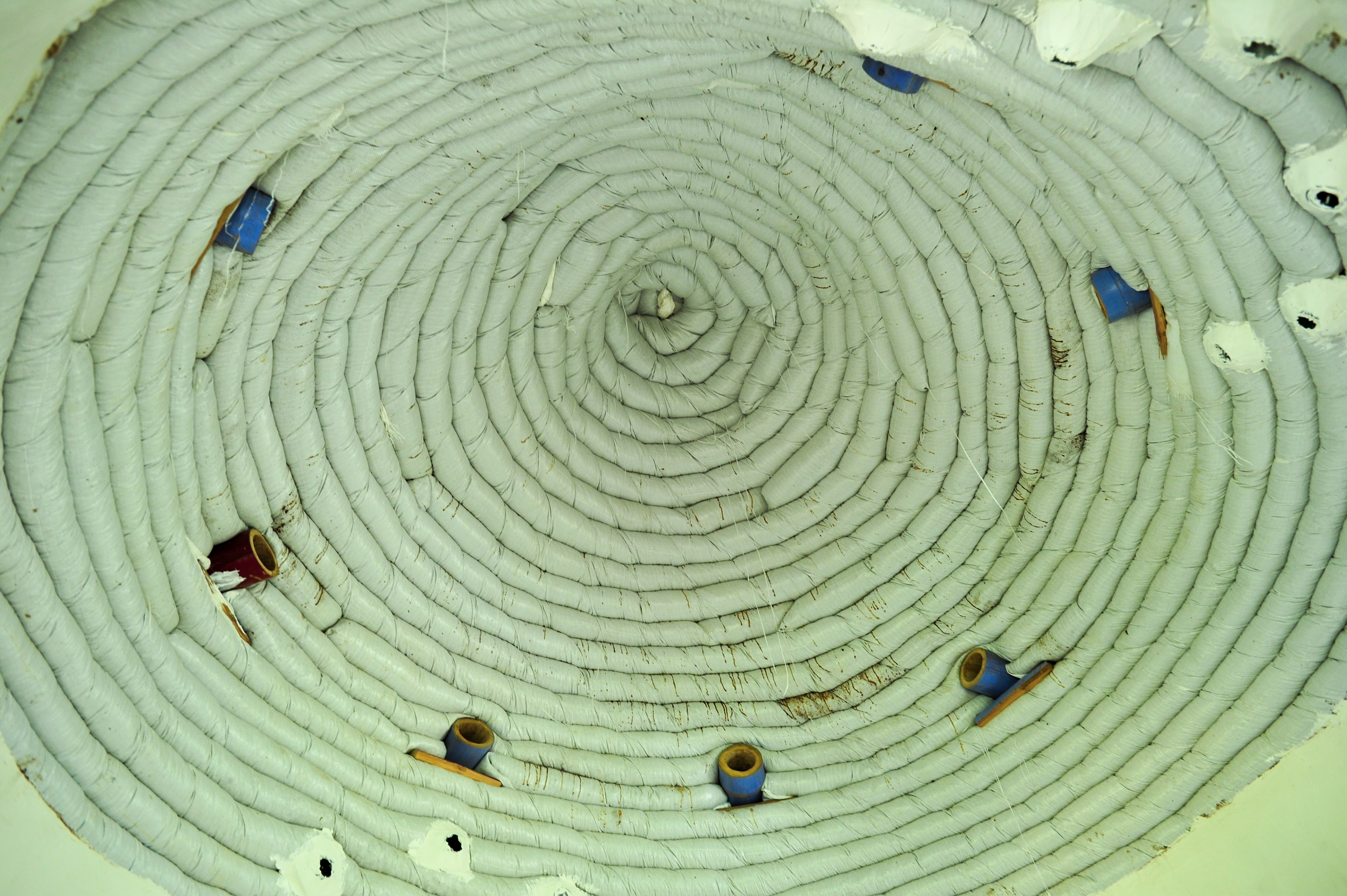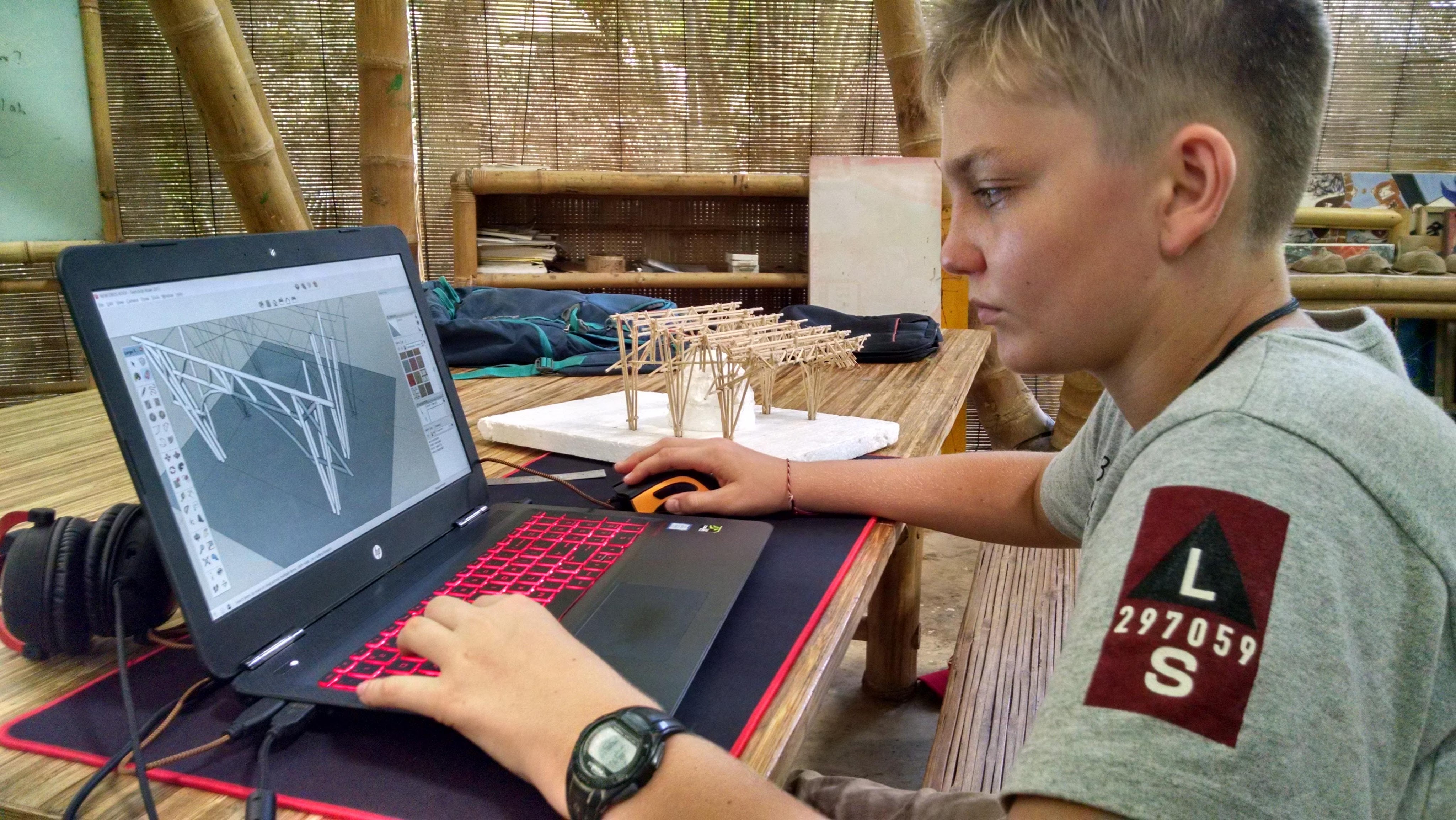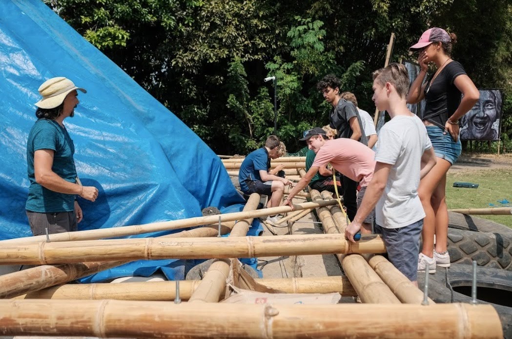 The technique can be used to create whole structures like the dome, or part of a building like the Media Arts Lab, that supported a bamboo second story and a roof for solar panels and water collection.