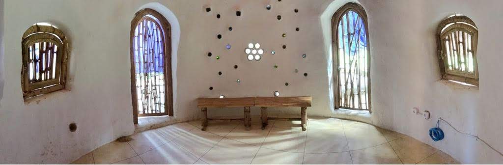 The roof also protected an earlier project built with super adobe, and created an indoor outdoor shade, rain protection space and an amphitheater.