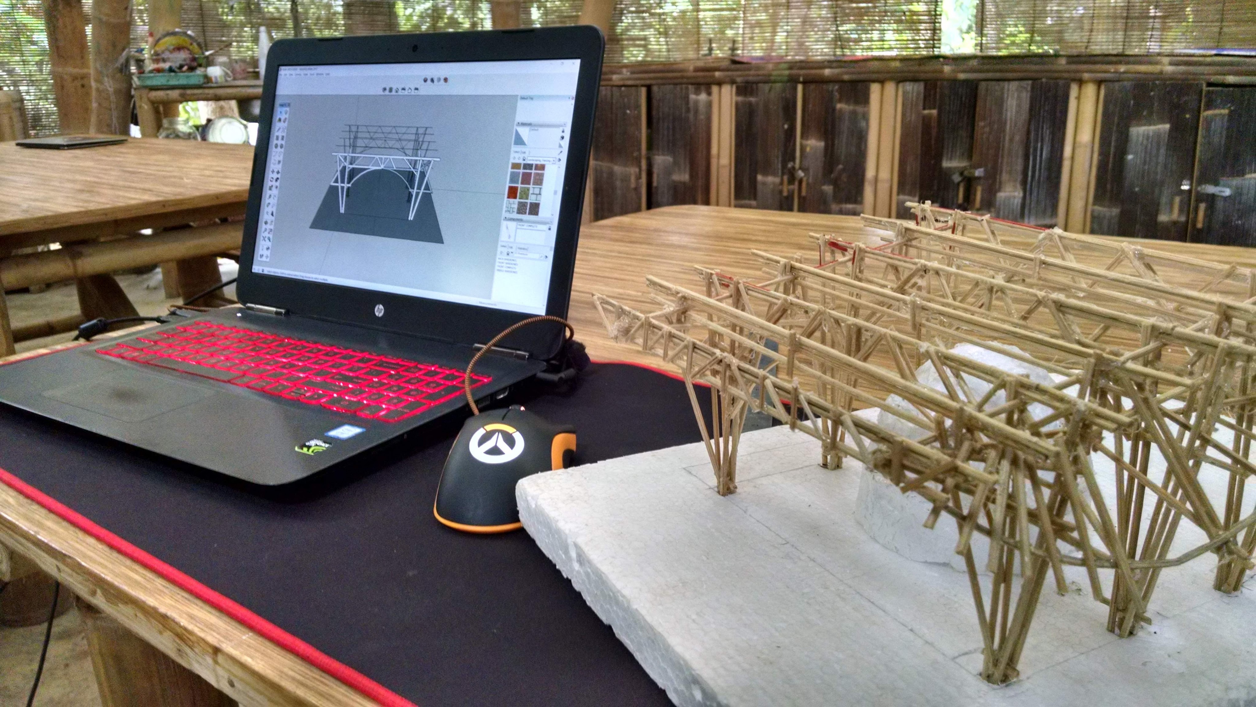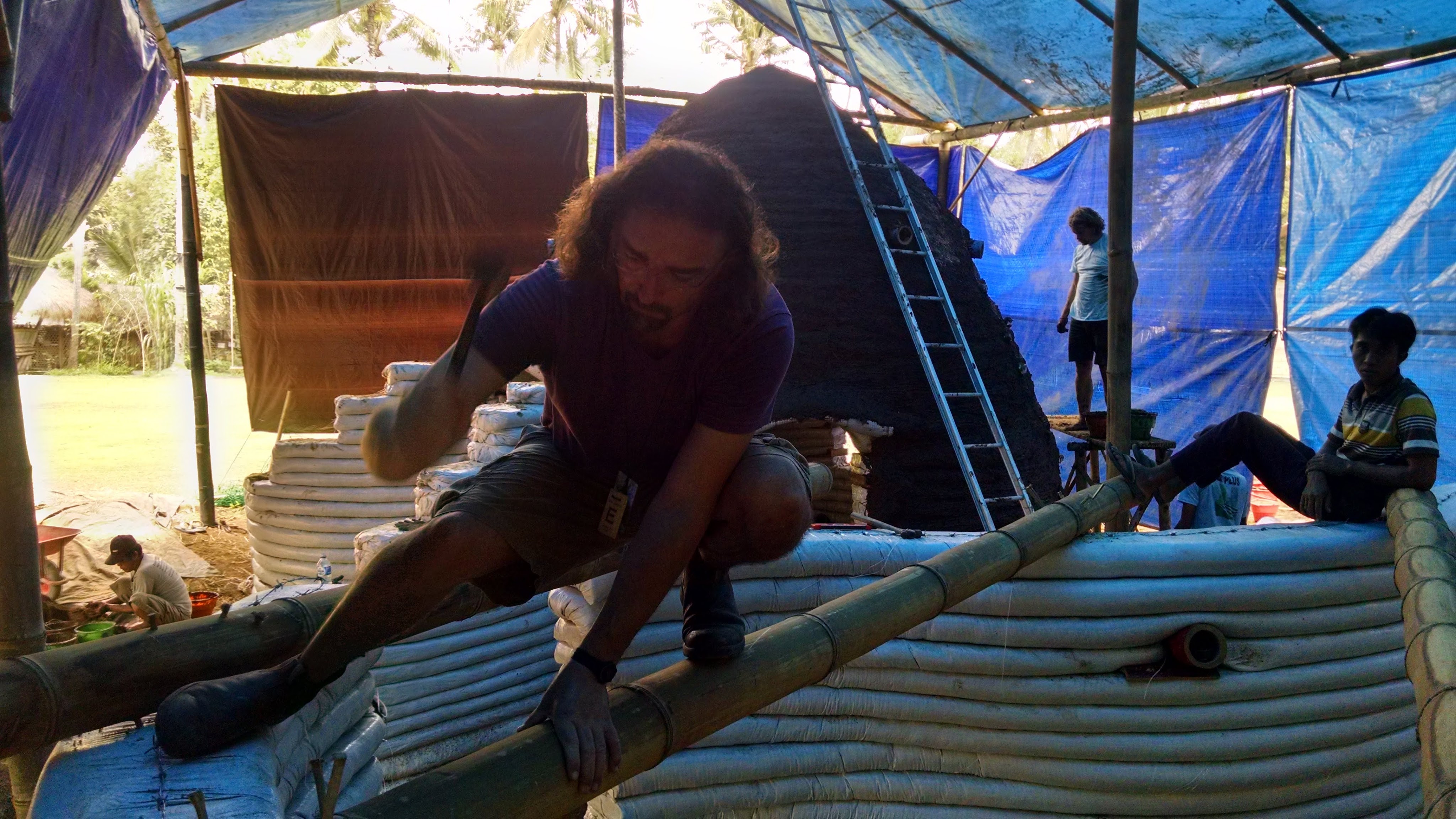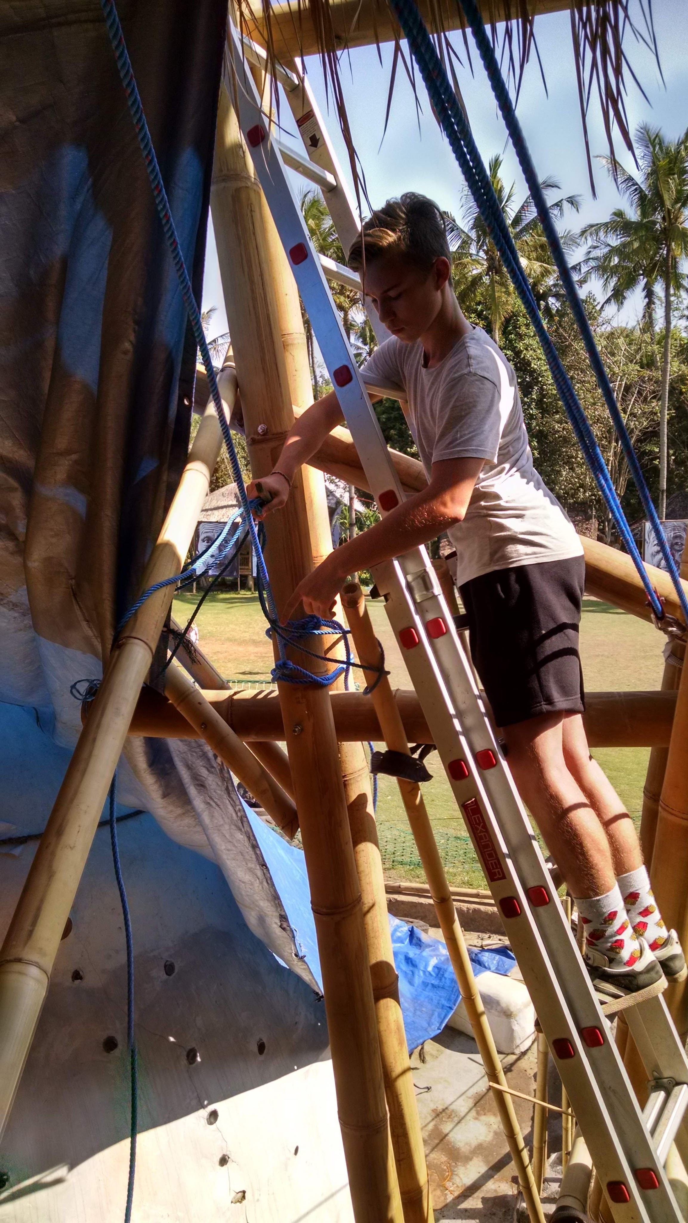 OROS, Operation Rain or Shine. This was a unique Student project using many types of bamboo in innovative ways to create a stacked function roof. It had to be strong and flat enough to hold a large PV solar array (40 Panels) and a large area rain water collection for micro hydro and water storage.