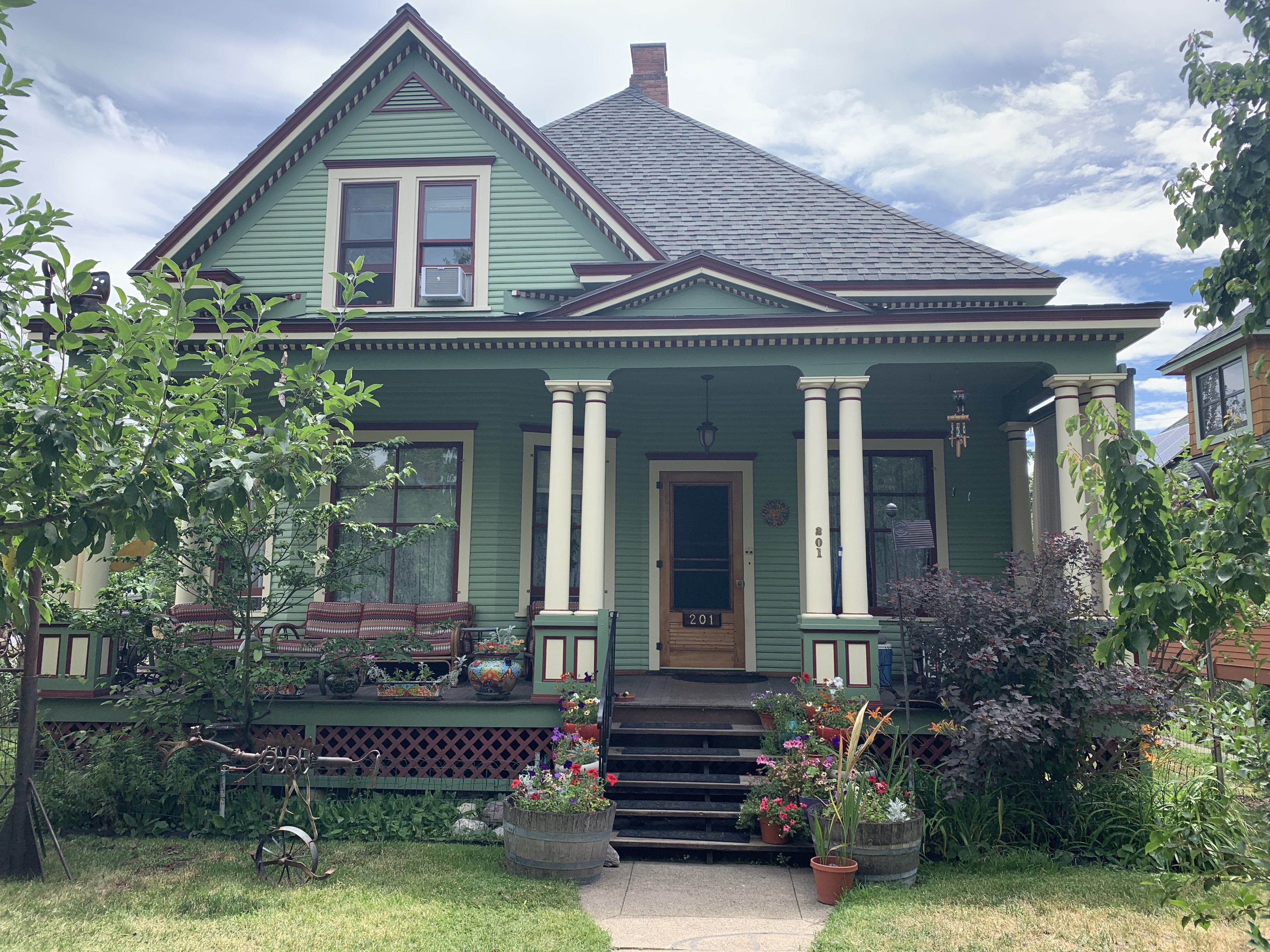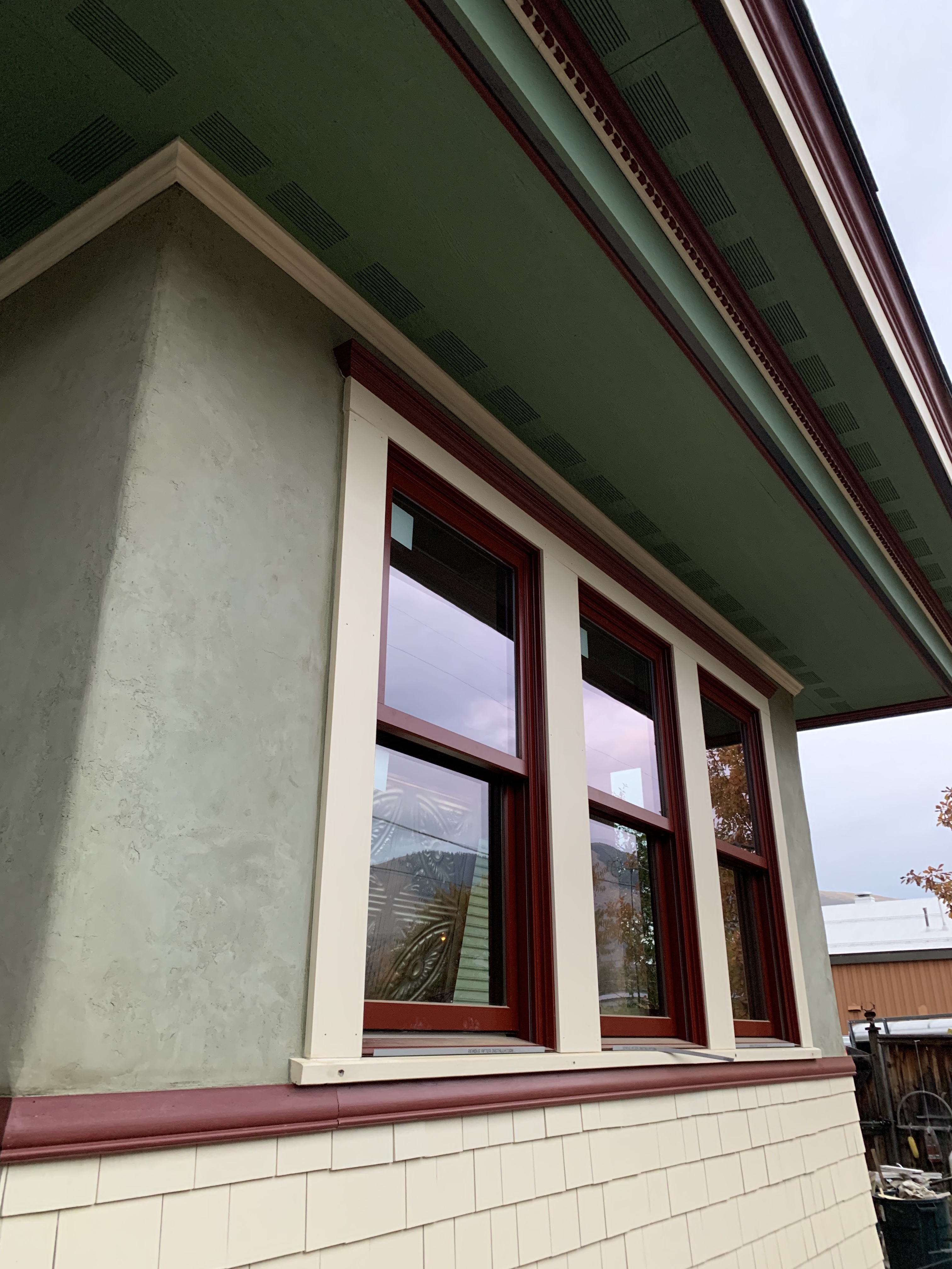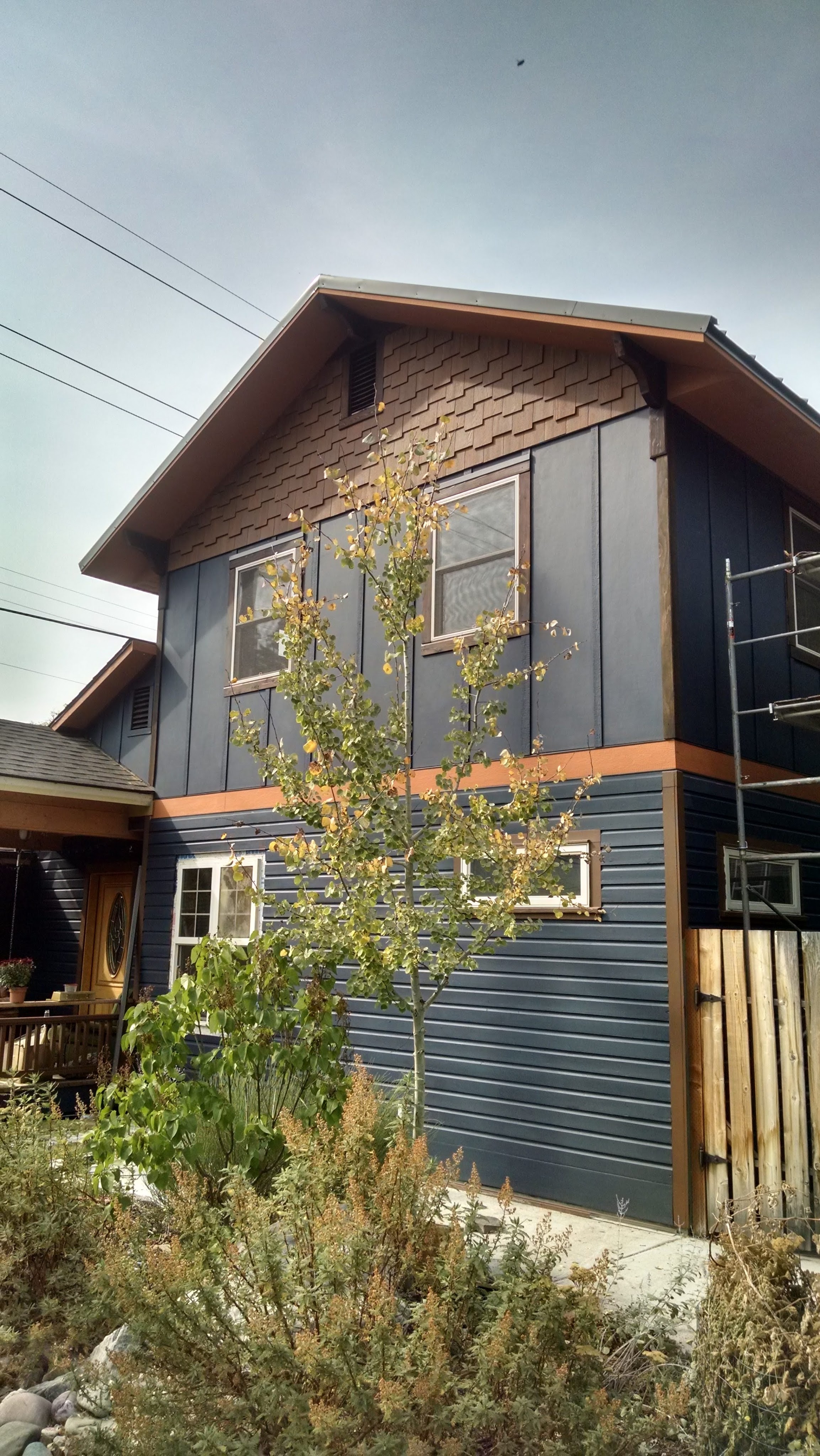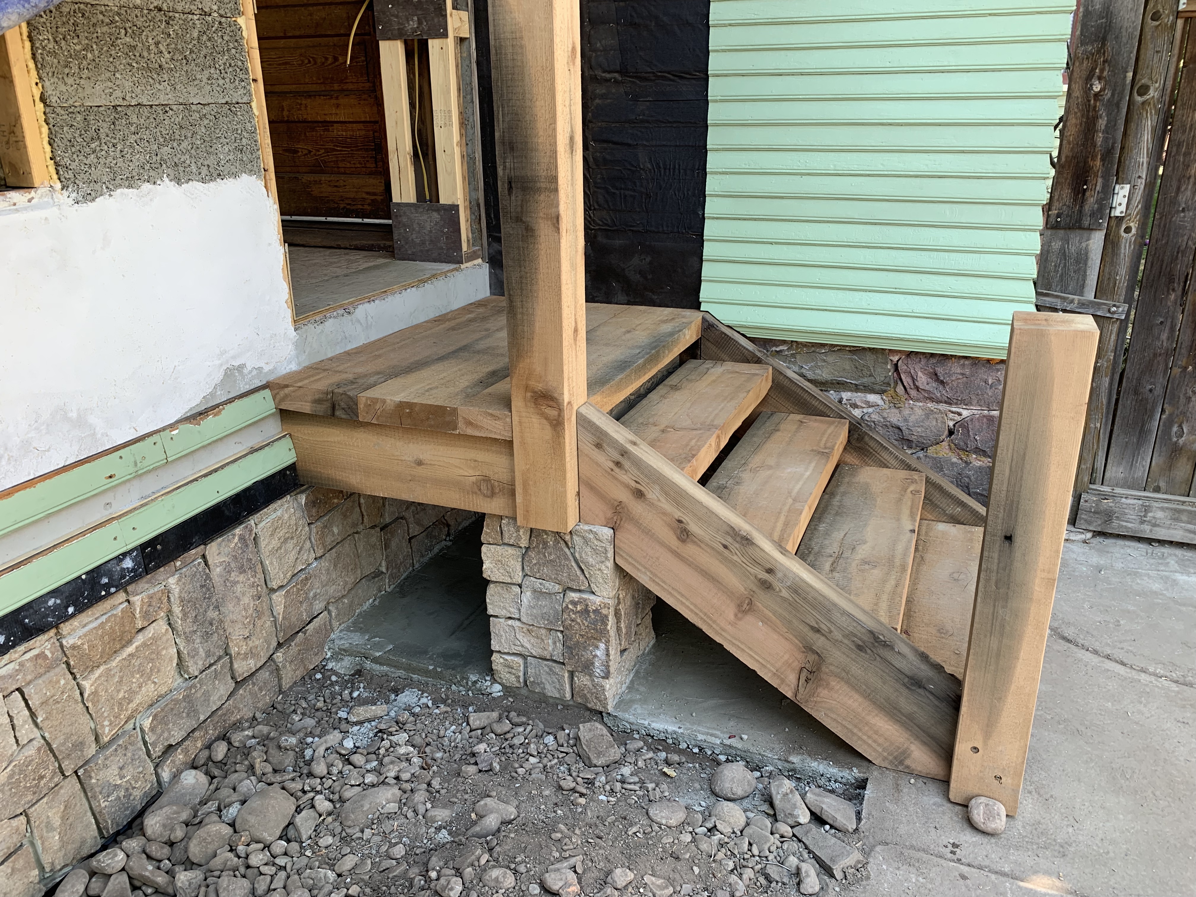 We mixed siding materials using reclaimed siding to imitate shake siding, cedar and redwood trim, bat and board with repurposed siding for bats, and reclaimed heritage timbers from the historic Missoula Mercantile for the stair stringers and barn floor timbers for the treads.